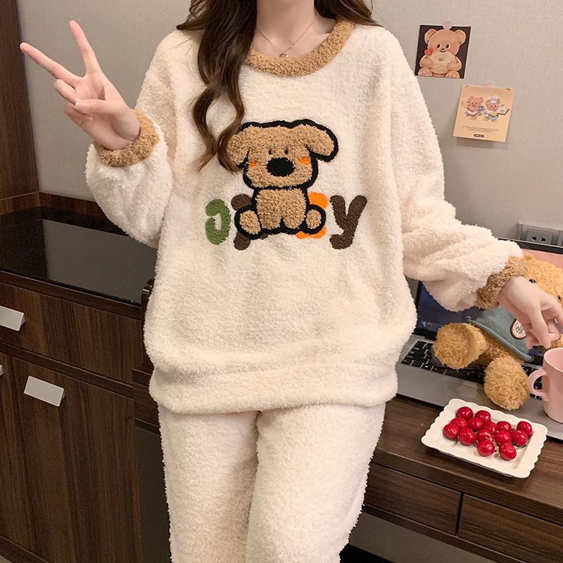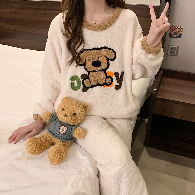 冬季新款睡衣女半边绒卡通圆领休闲家居服套装 服裝批發女裝批發服飾貨源