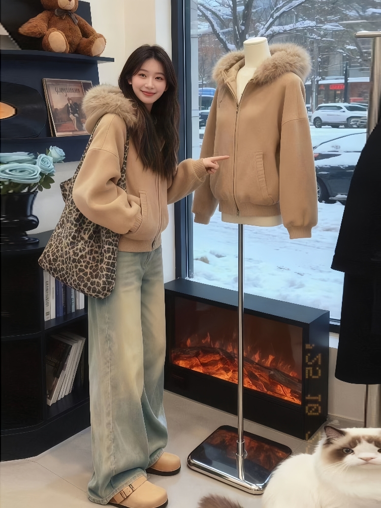 独特漂亮两件套慵懒风高级感巨好看卡其色毛领针织外套牛仔裤套装 服裝批發女裝批發服飾貨源