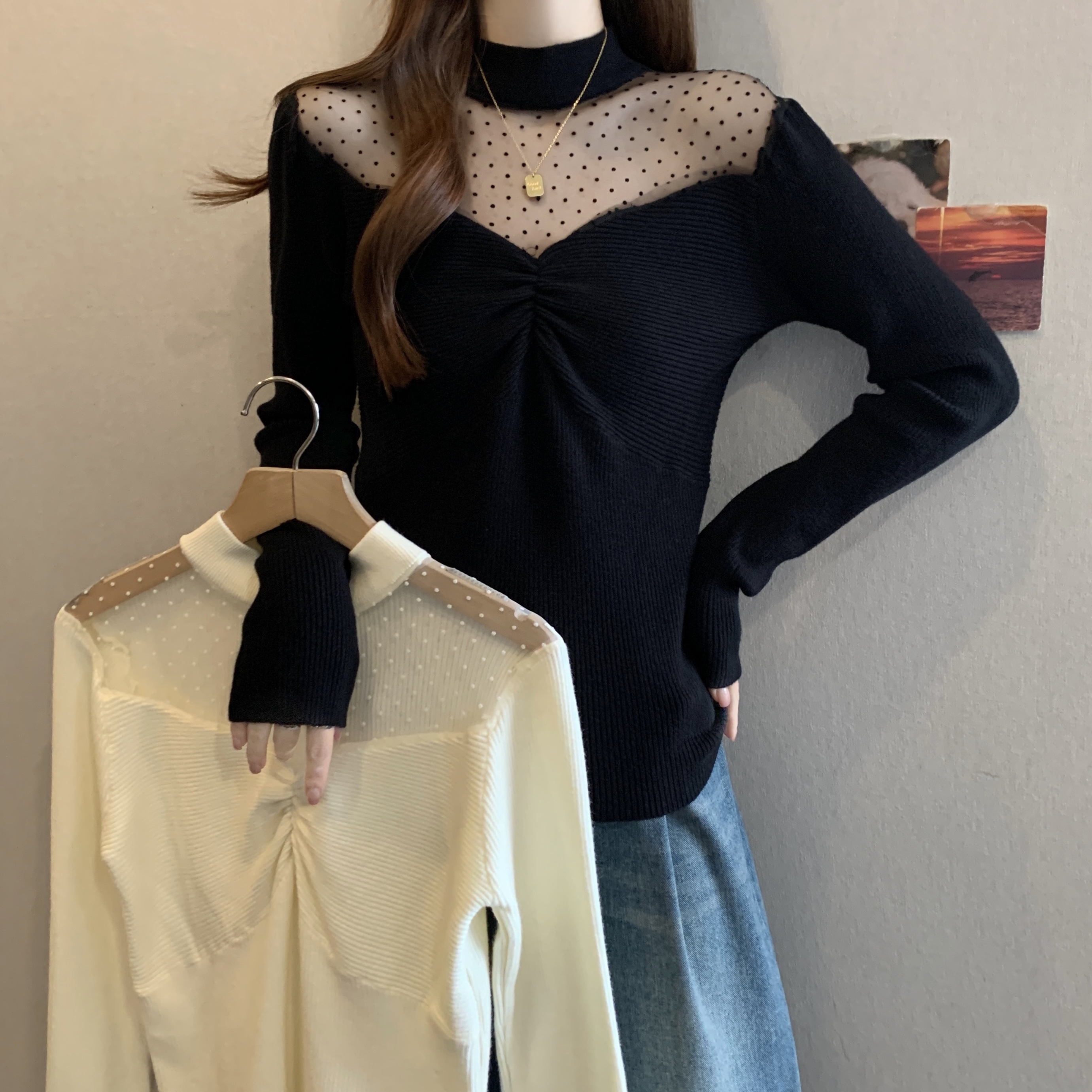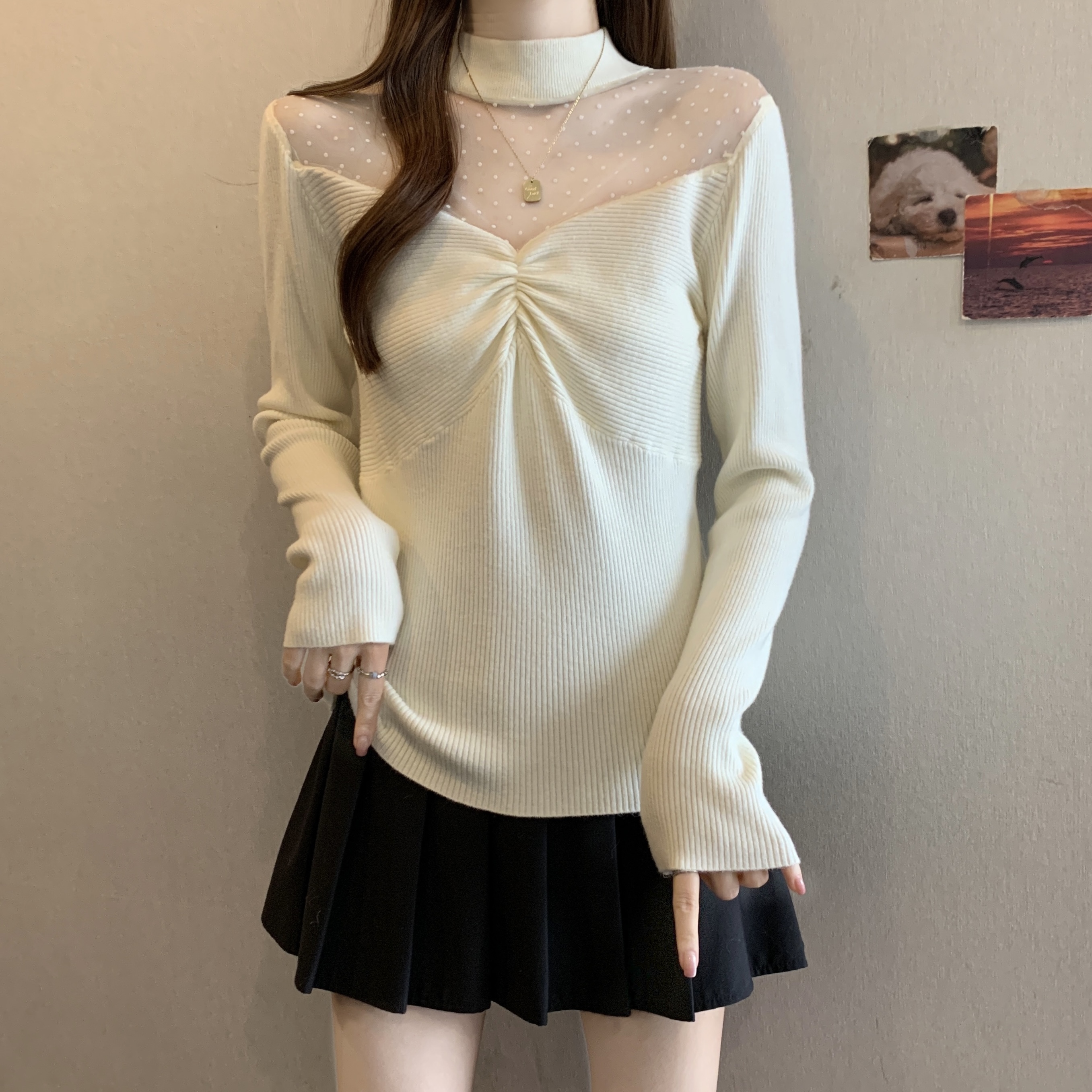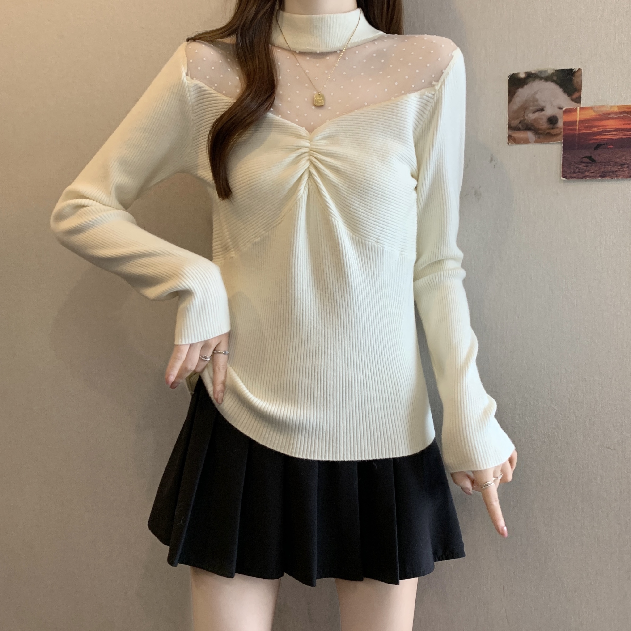 Home > 毛衣、针织衫 > FA50728# 秋冬胖mm新款法式网纱拼接针织衫女纯欲风温柔修身褶皱毛衣