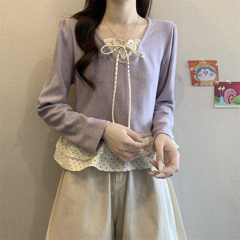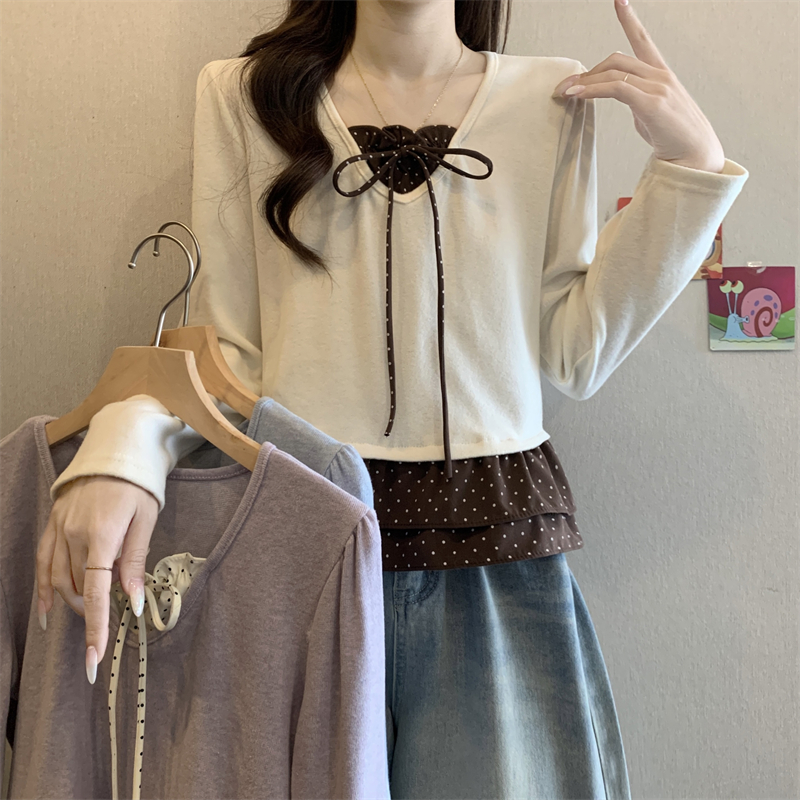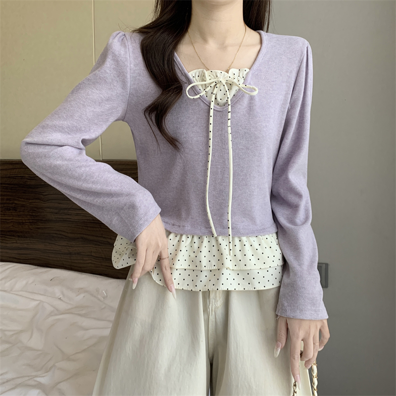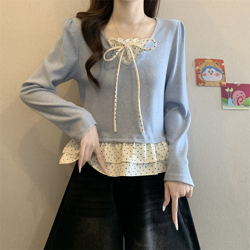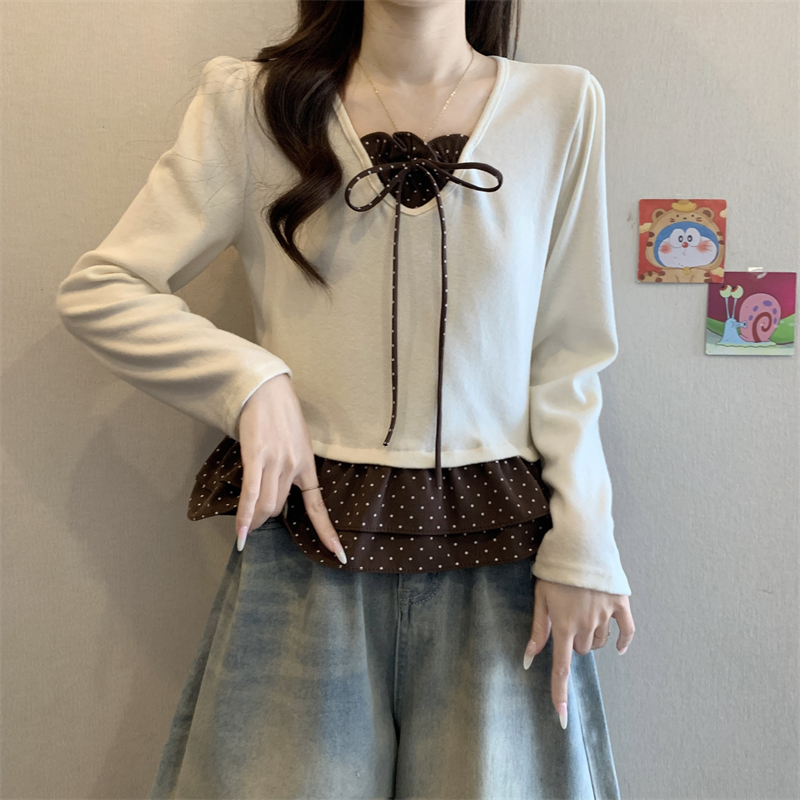 FA50754# 新版法式气质泡泡袖木耳边蝴蝶结系带上衣