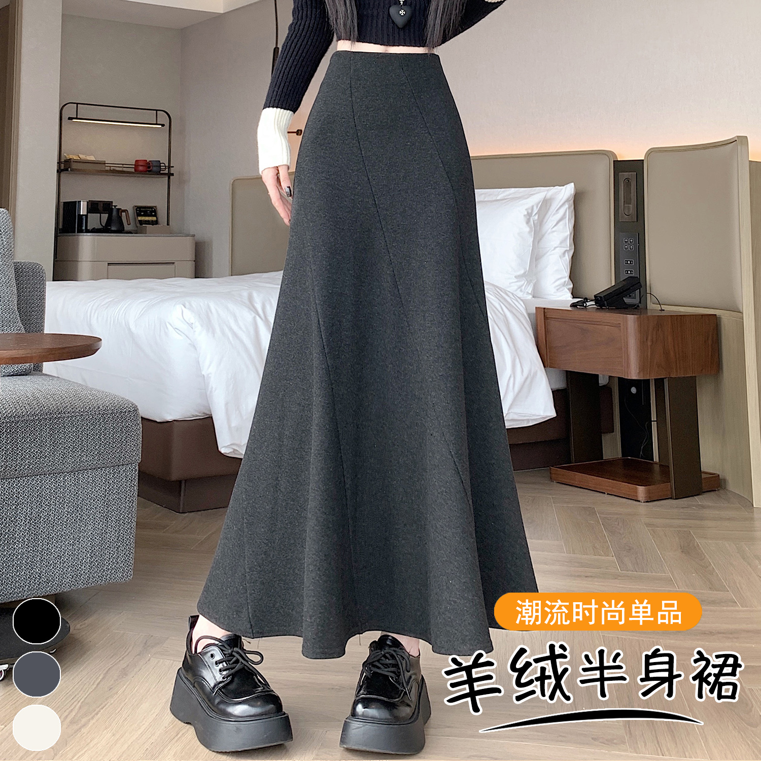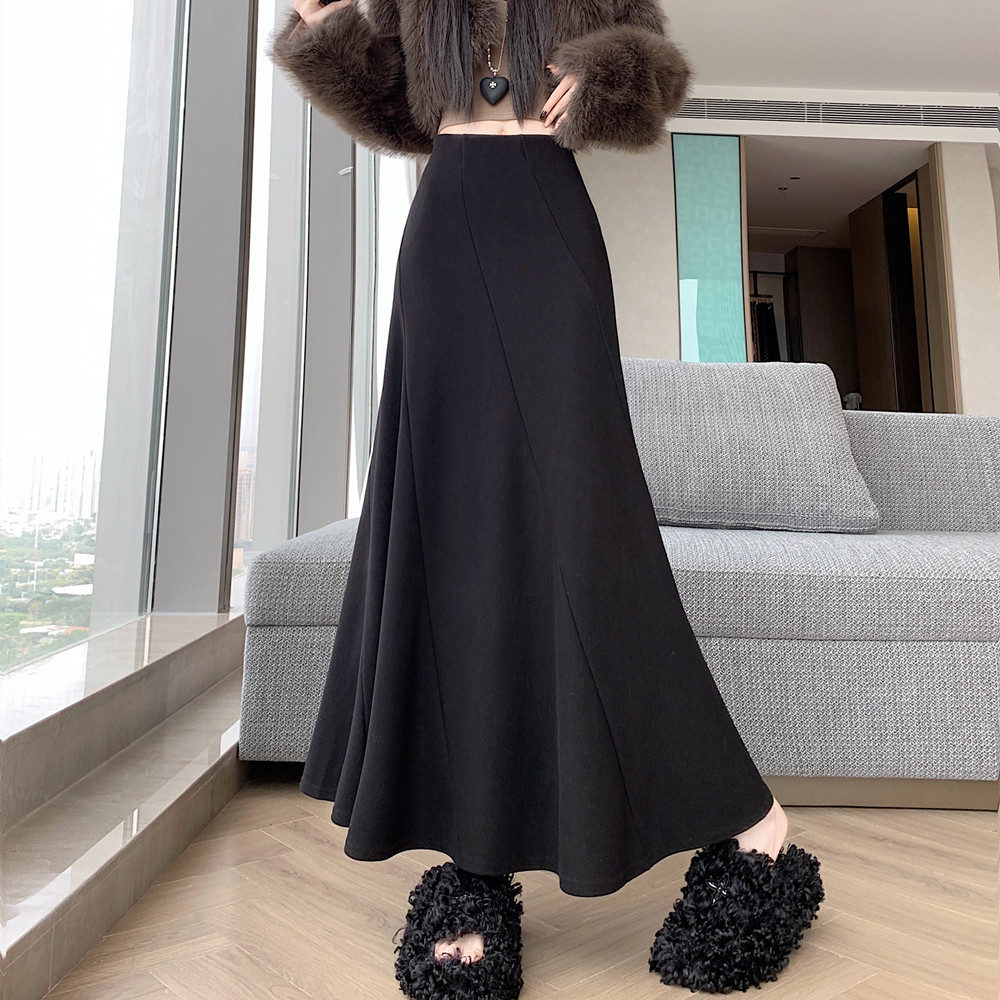 FA50898# 秋冬新款加厚羊绒半身裙设计感拼接高腰显瘦鱼尾长款a字裙 服裝批發女裝批發服飾貨源