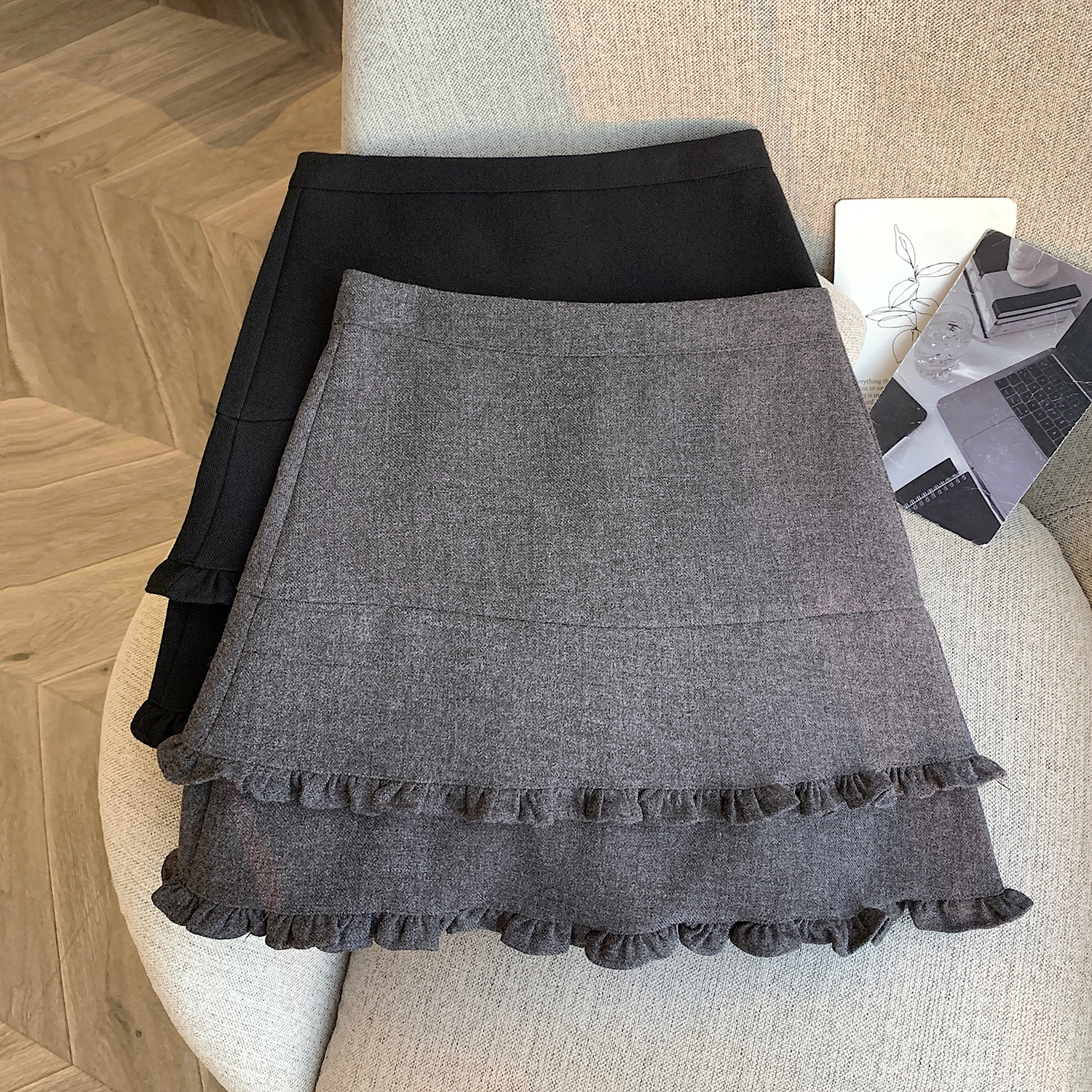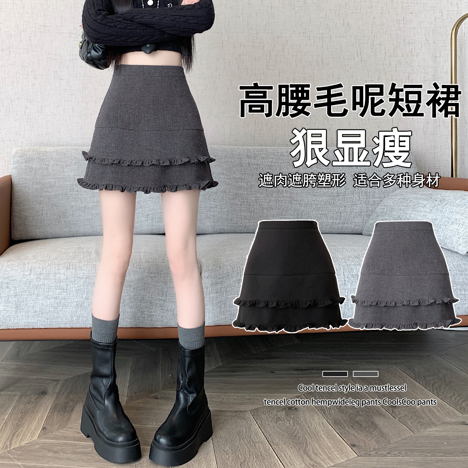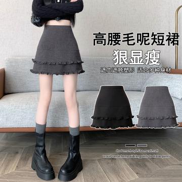 FA50899# 韩版设计感高腰木耳边毛呢半身裙秋冬百搭显瘦半身裙A字裙 服裝批發女裝批發服飾貨源
