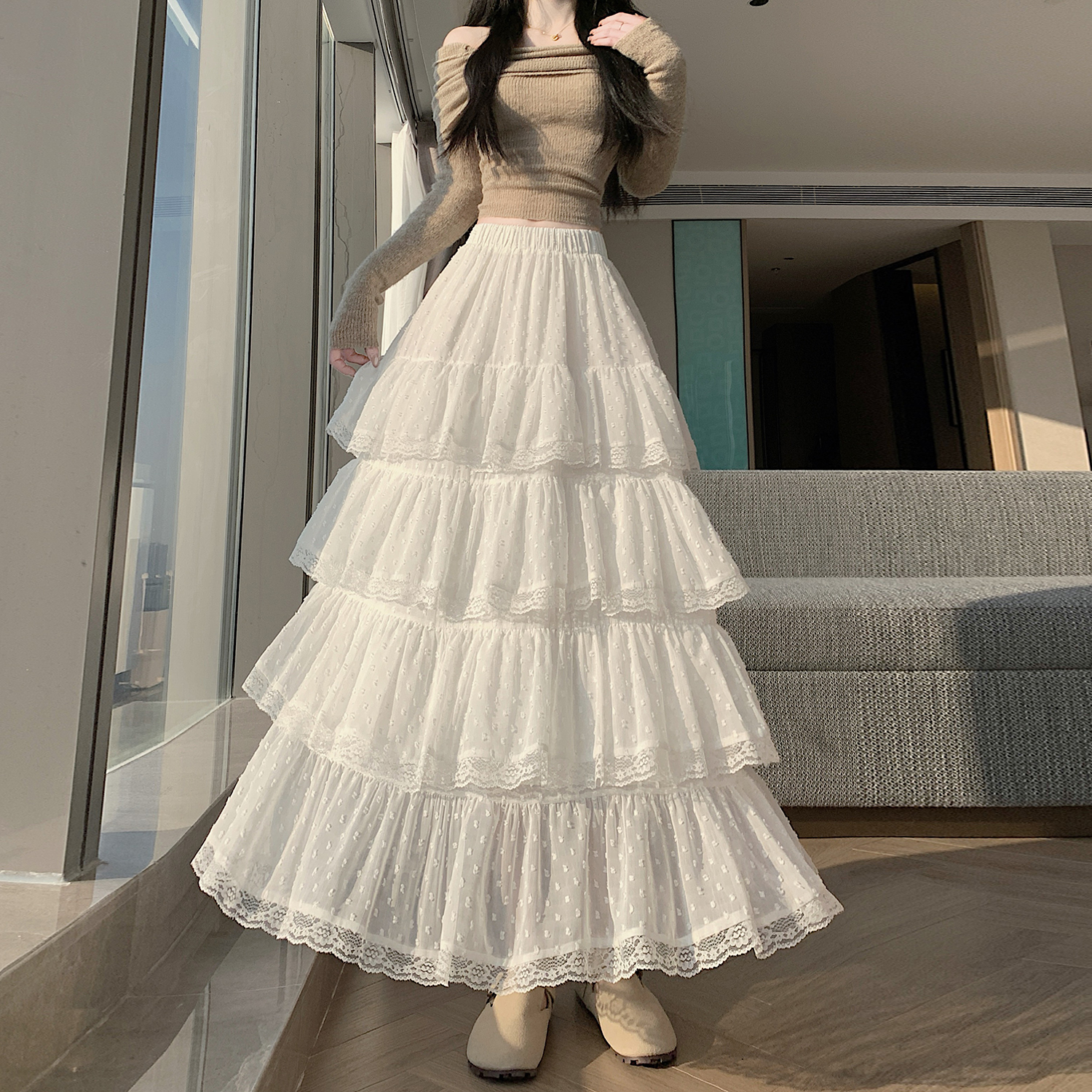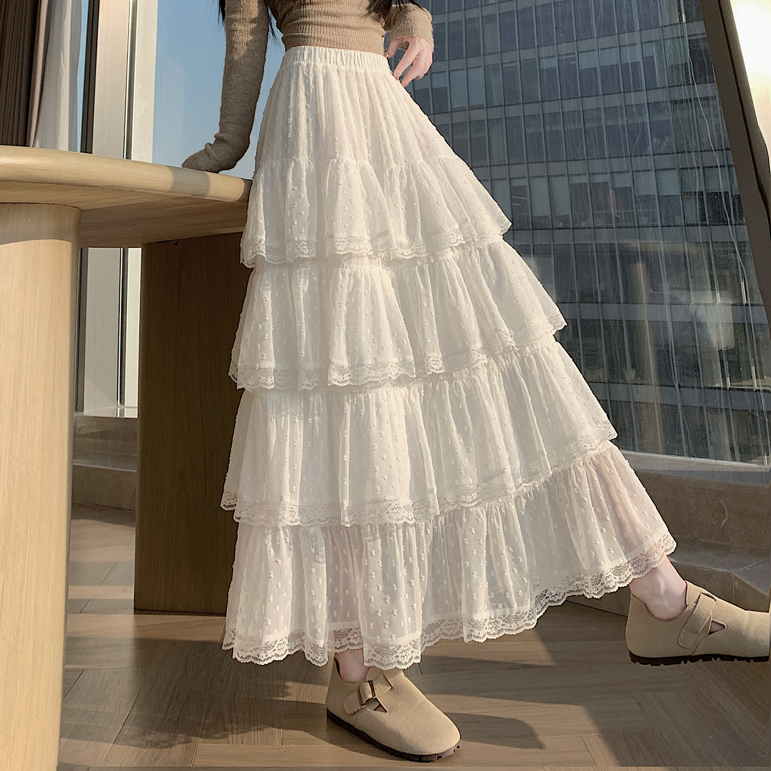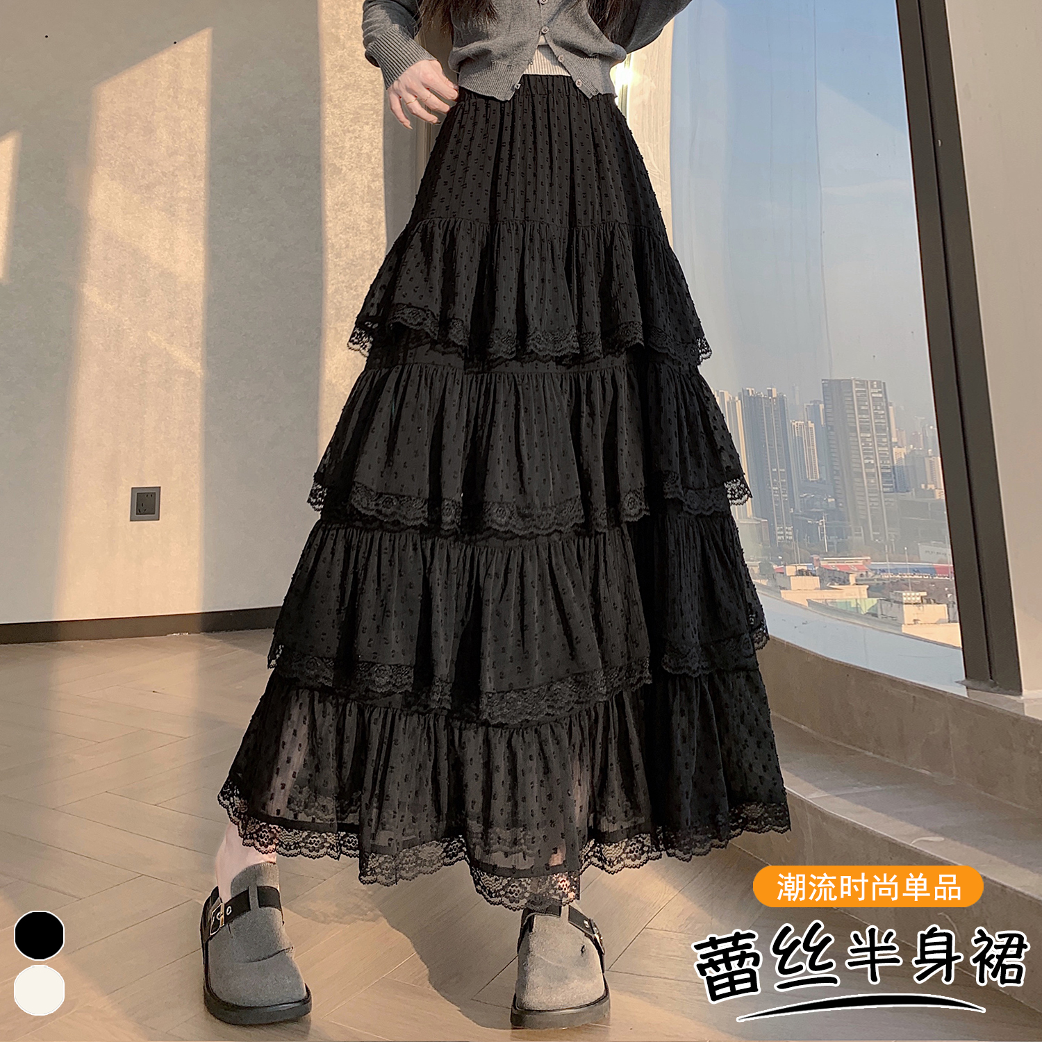 FA50901# 韩系提花拼接蕾丝蛋糕裙秋冬宽松荷叶边高腰百搭A字长裙 服裝批發女裝批發服飾貨源
