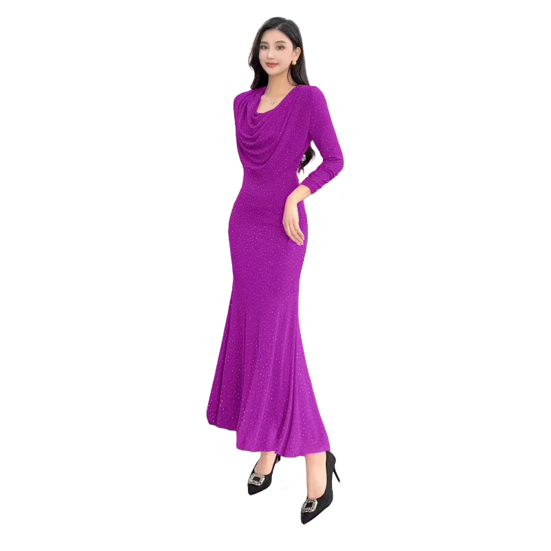 FA51146# 淑女气质高级感秋季长袖连衣裙收腰显瘦修身包臀鱼尾礼服长裙 服裝批發女裝批發服飾貨源
