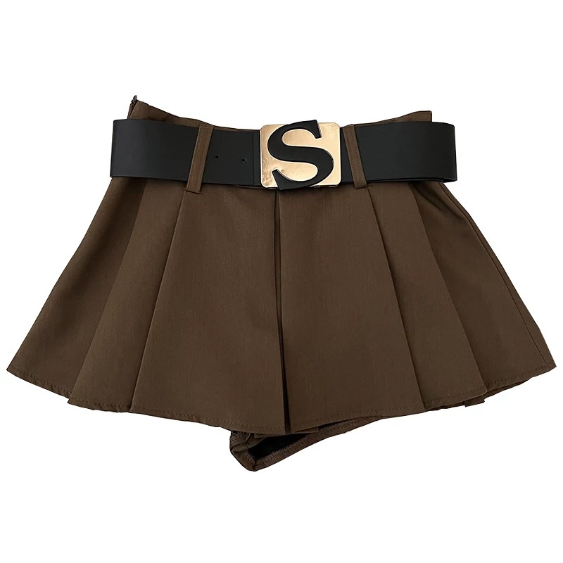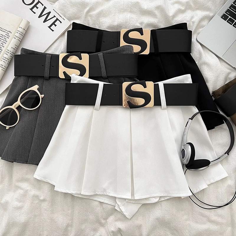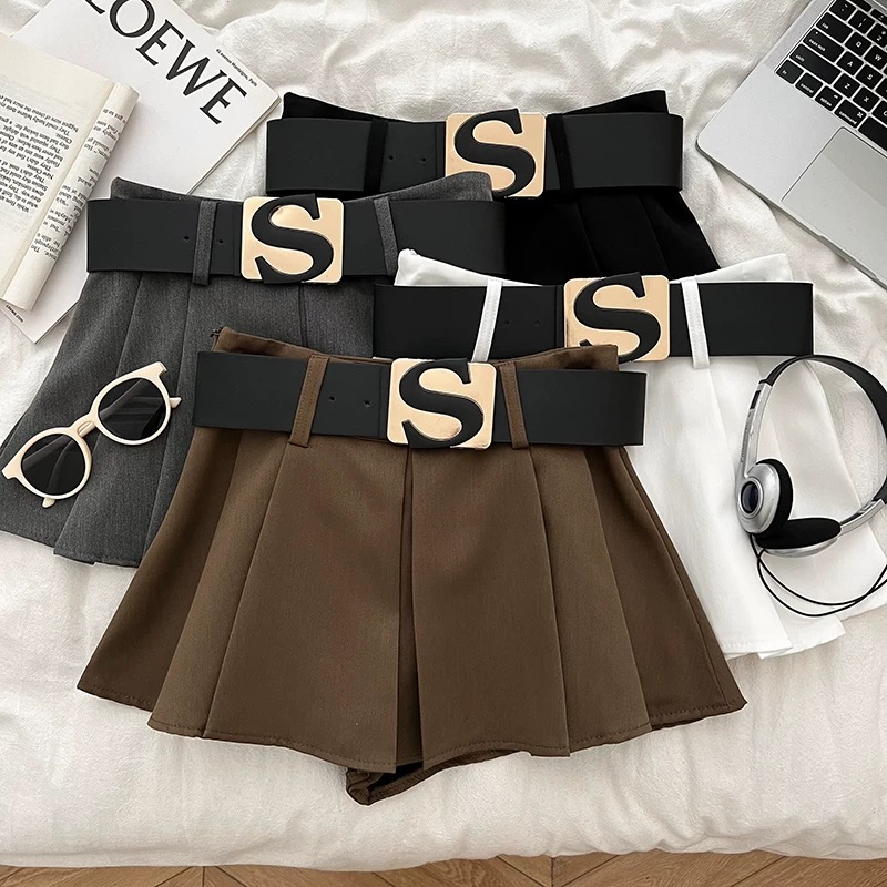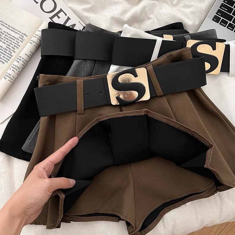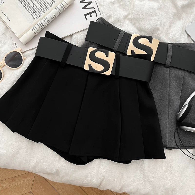 FA51219# 设计感休闲百搭字母腰带高腰显瘦半身裙防走光短裙百褶裙a字裙女 服裝批發女裝批發服飾貨源