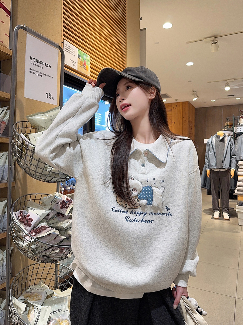FA51228# 纯棉华棉复合真超加绒卫衣女宽松卡通刺绣POLO领保暖上衣 服裝批發女裝批發服飾貨源