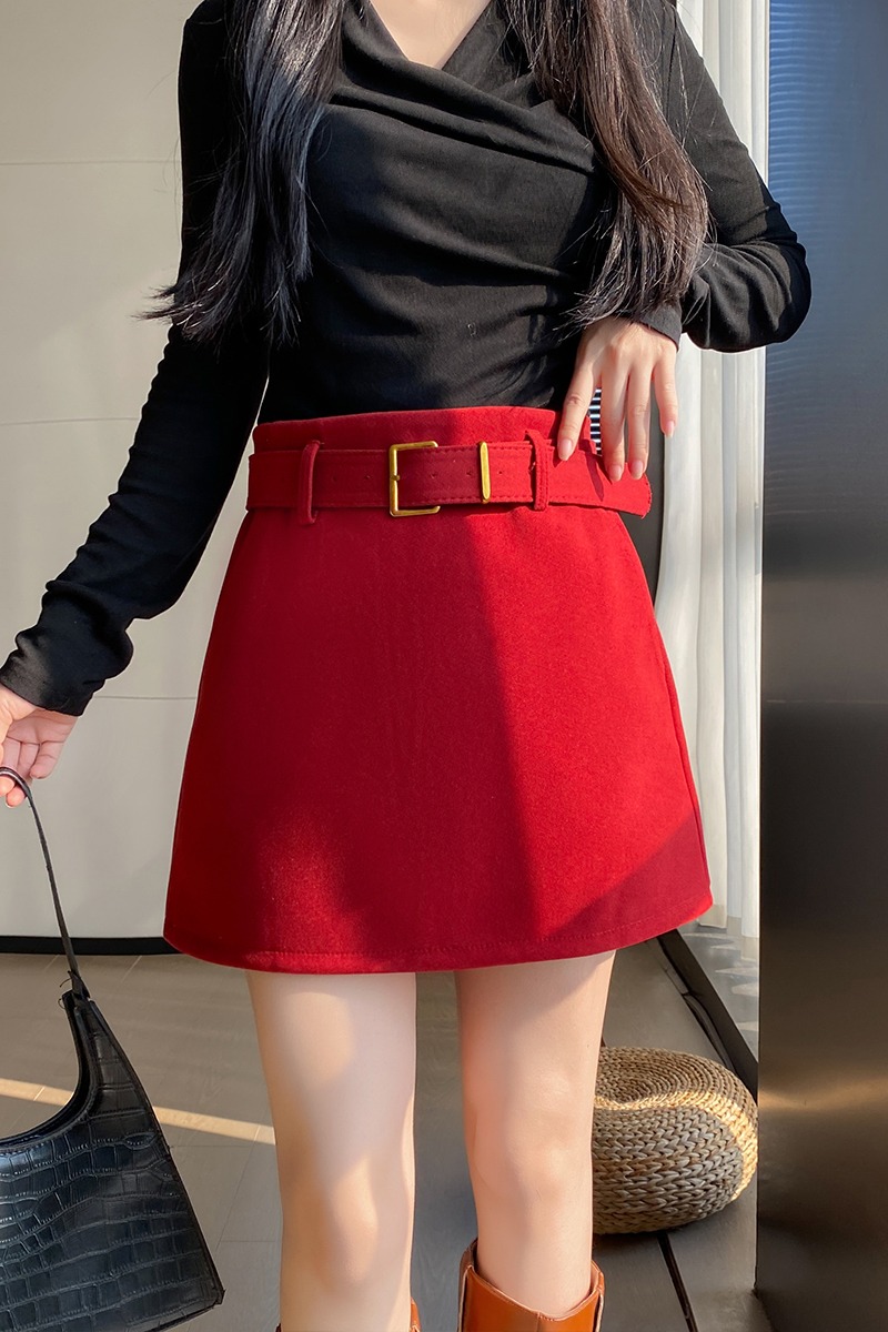 FA51275# 红色毛呢半身裙女秋冬辣妹高腰显瘦小个子防走光包臀a字短裙 服裝批發女裝批發服飾貨源