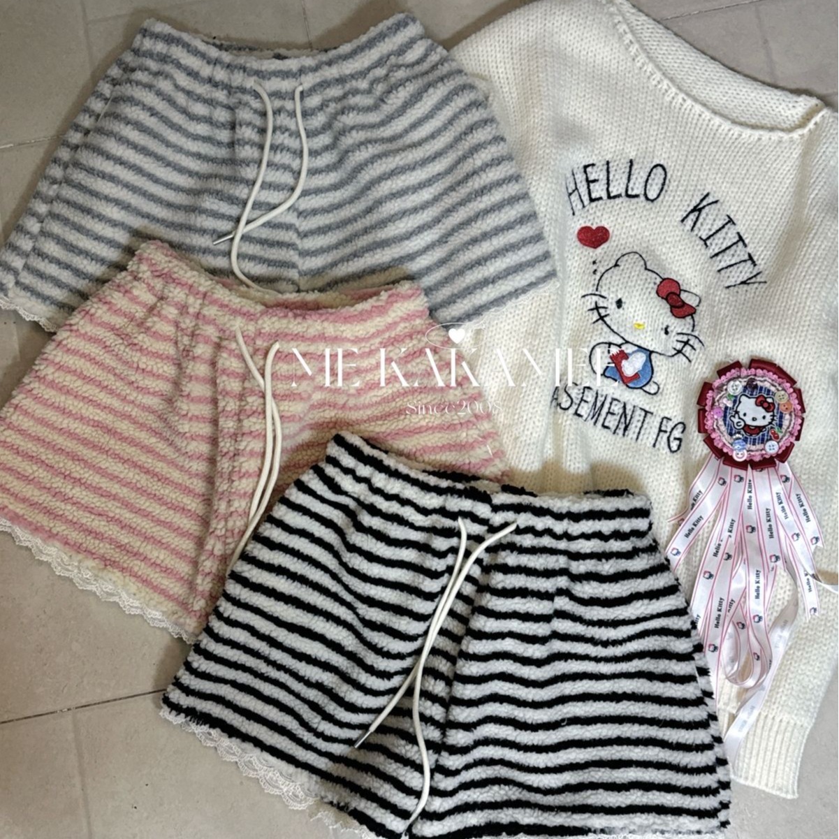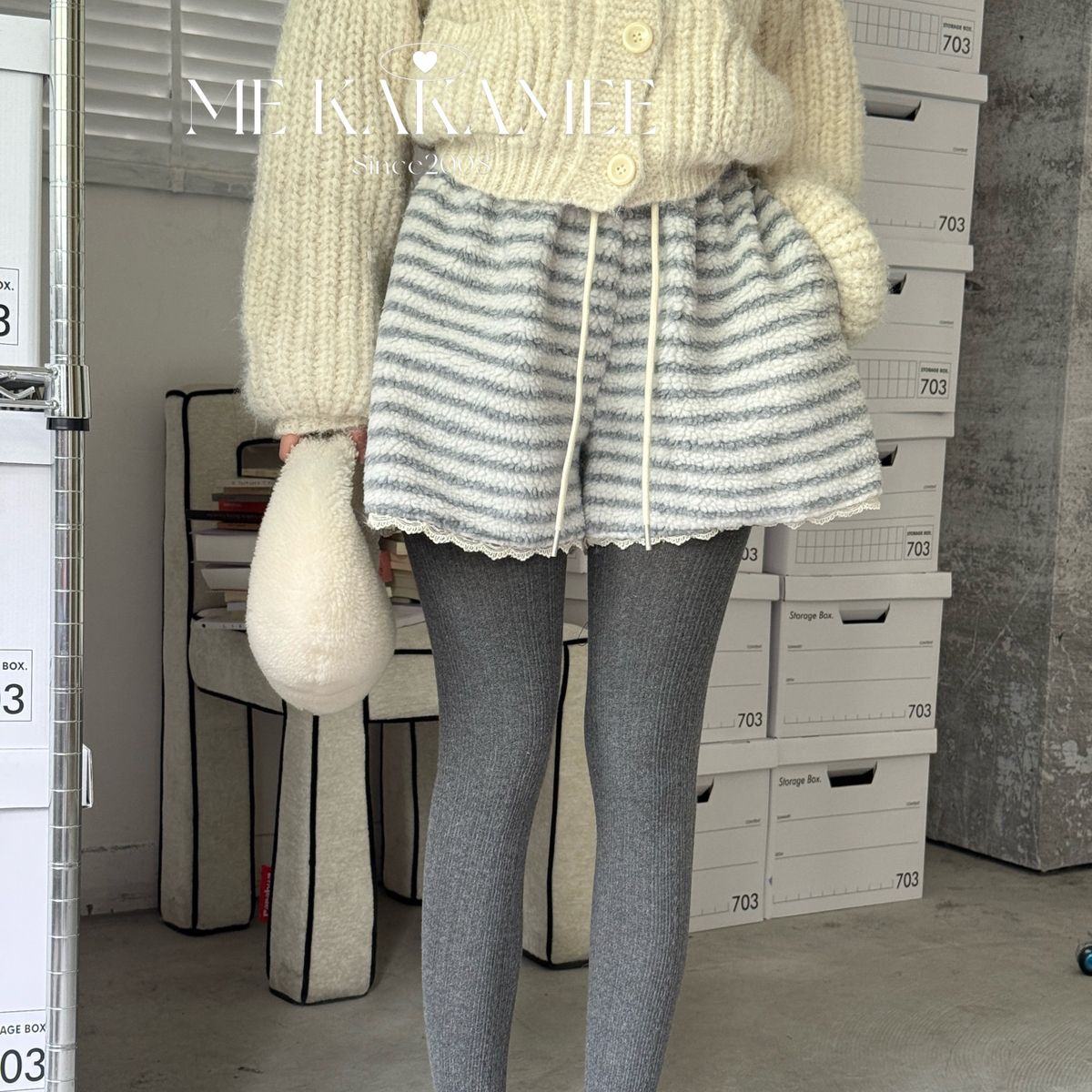 FA51446# 甜美撞色条纹蕾丝拼接仿羊羔毛休闲短裤女秋季高腰抽绳系带阔腿裤 服裝批發女裝批發服飾貨源