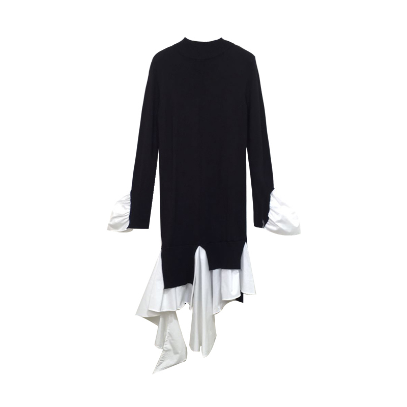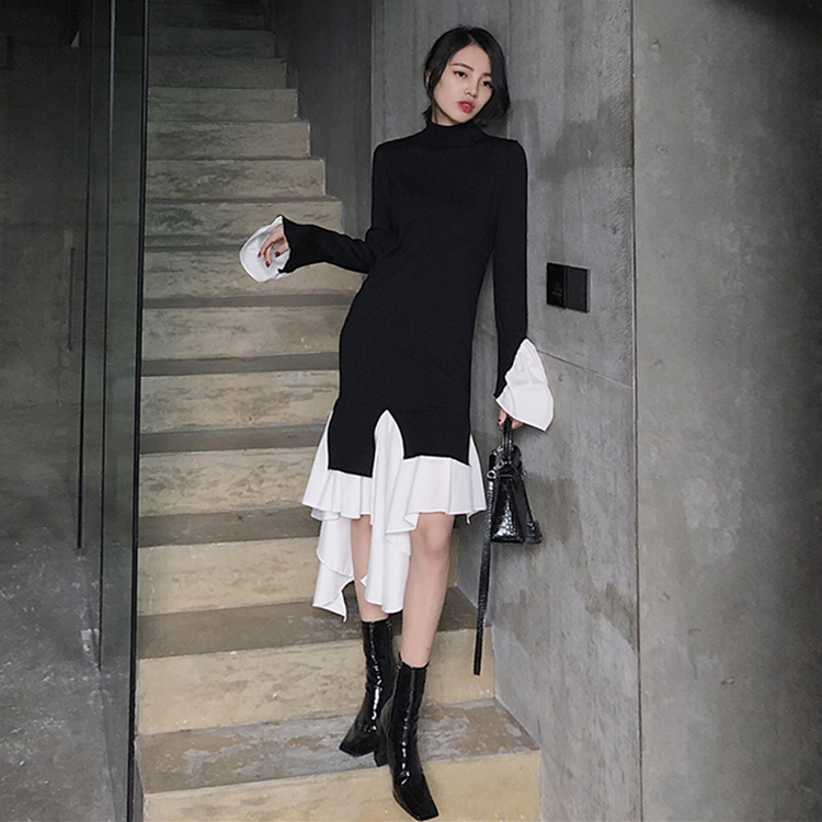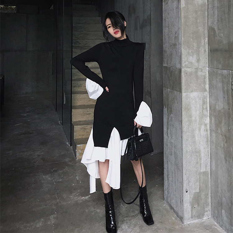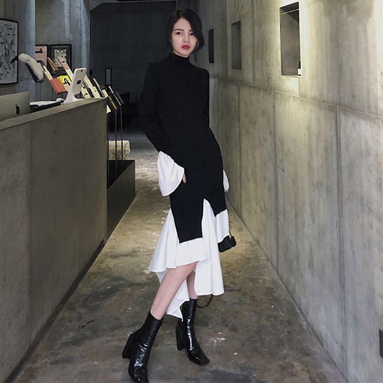 FA51465# 春秋新款韩版拼接不规则复古修身长裙显瘦显高气质针织连衣裙 服裝批發女裝批發服飾貨源