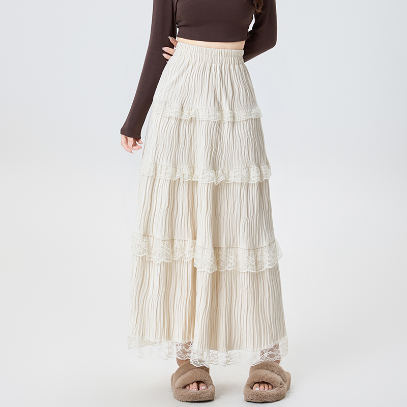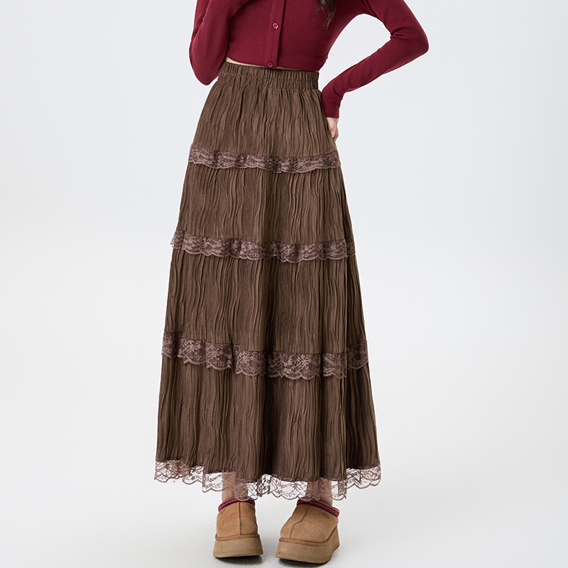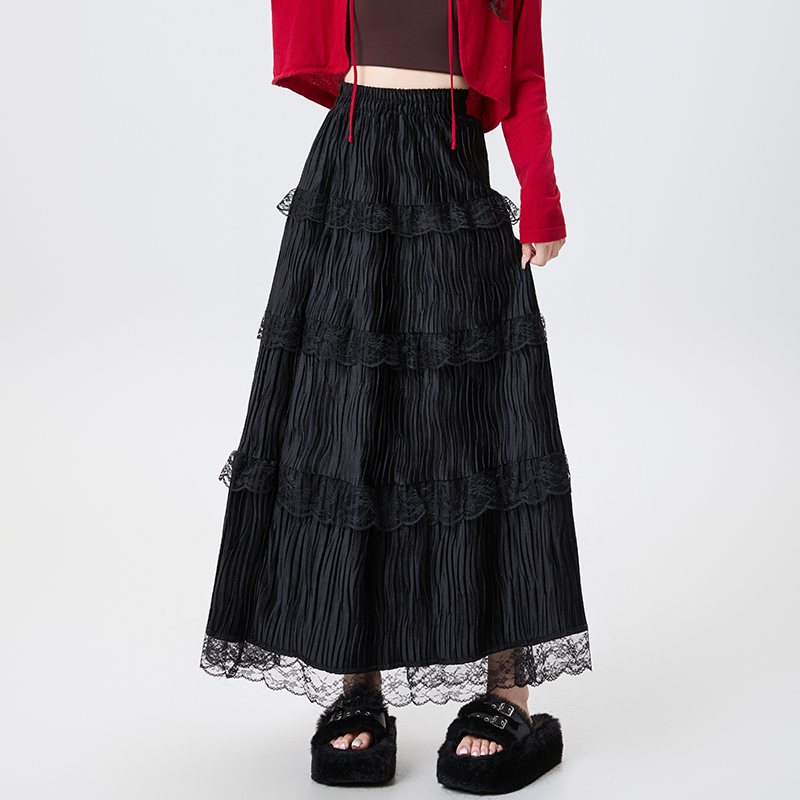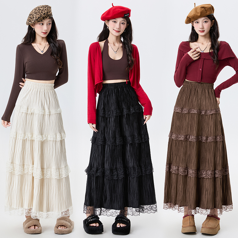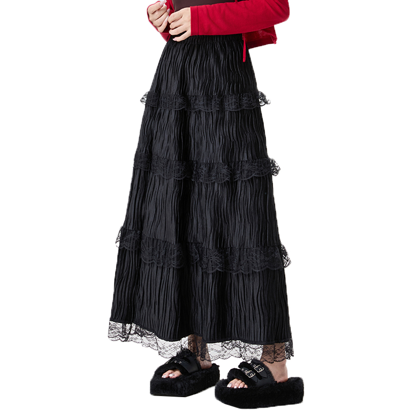 FA51512# 蕾丝拼接丝绒半身裙女秋冬高腰显瘦中长款褶皱A字仙女裙 服裝批發女裝批發服飾貨源
