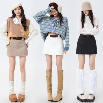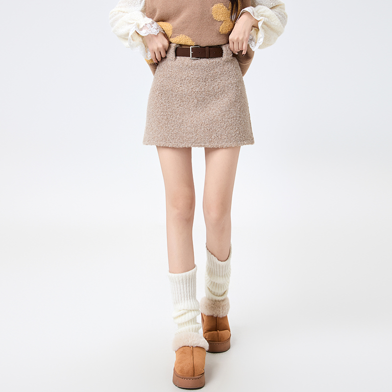 FA51515# 甜酷辣妹仿羊羔绒短裙秋冬高腰显瘦防走光A字半身裙腰带 服裝批發女裝批發服飾貨源