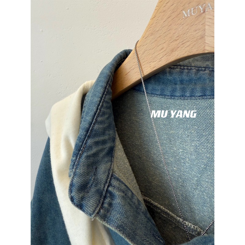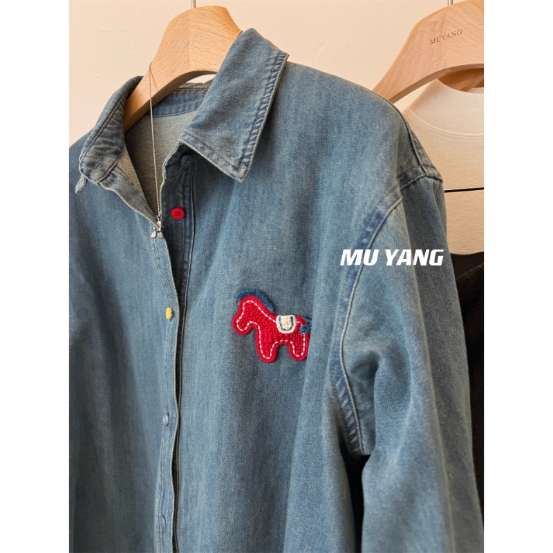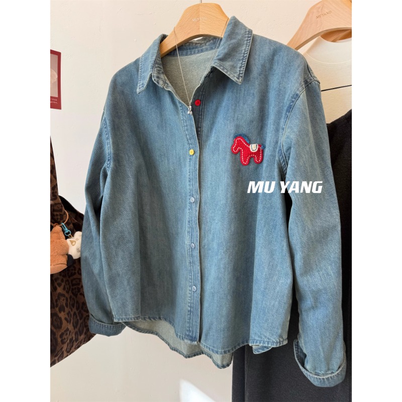 FA51556# 节日氛围元素红马儿牛仔衬衫叠穿水洗料长袖衬衣女冬 服裝批發女裝批發服飾貨源
