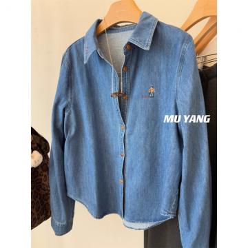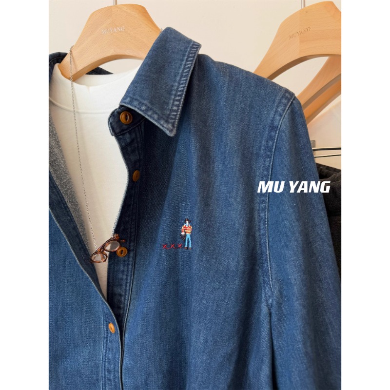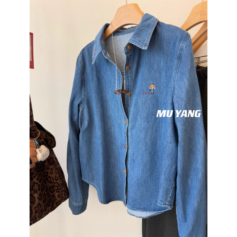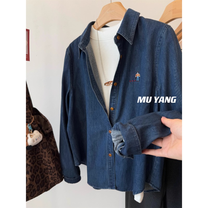 FA51558# 无限耐看韩国水洗刺绣小人拉绒牛仔衬衫叠穿秋冬衬衣 服裝批發女裝批發服飾貨源