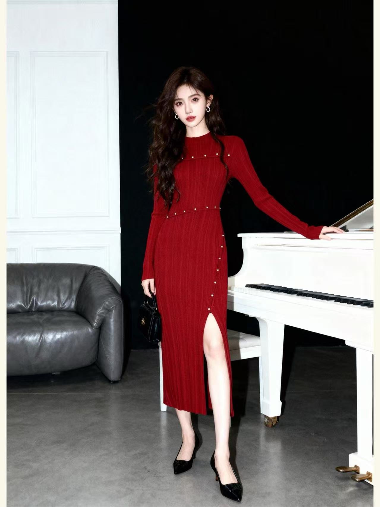 FA51634# 巨好看的早秋黑色开叉针织连衣裙法式气质淡人高知穿搭裙子 服裝批發女裝批發服飾貨源