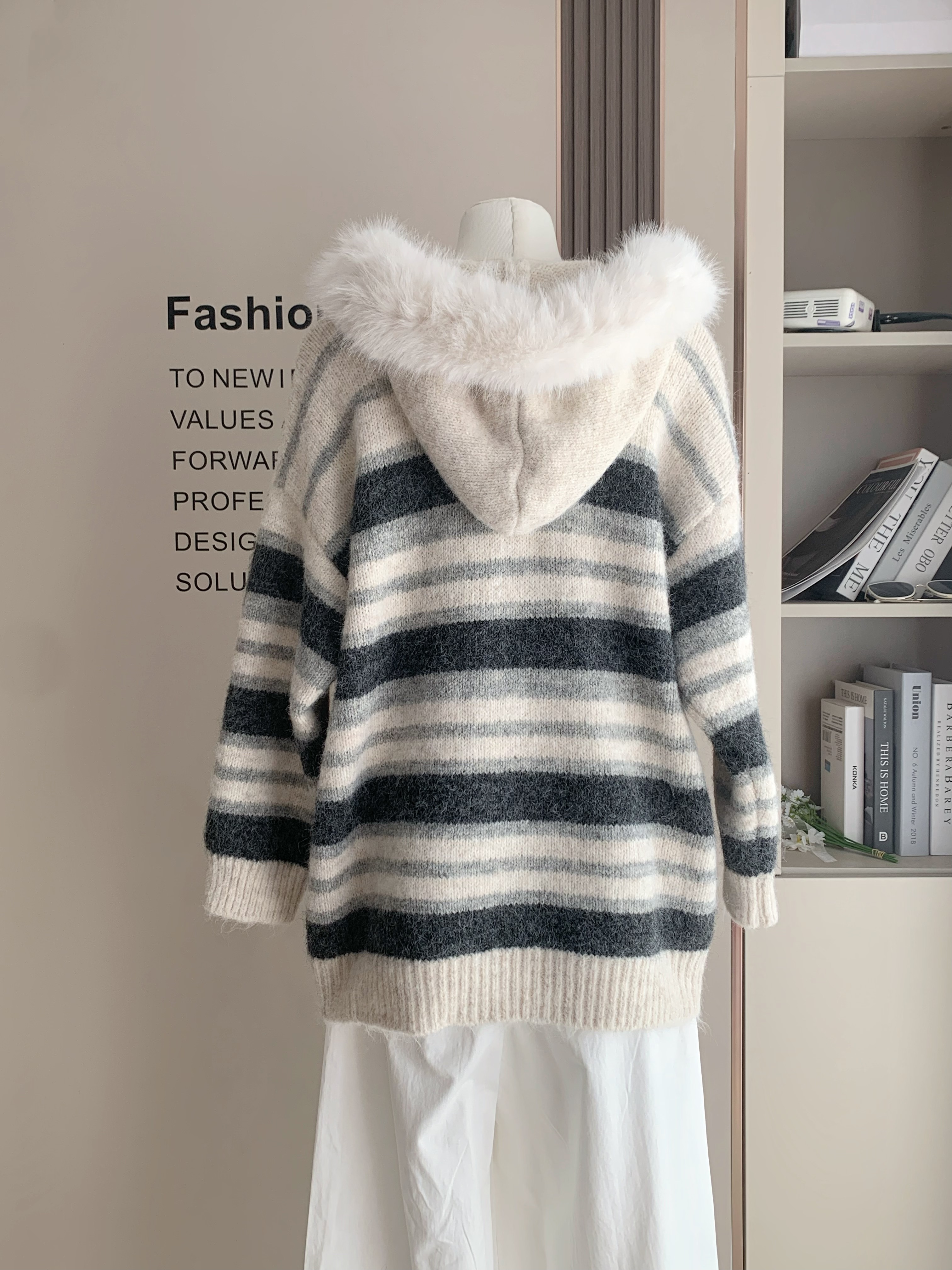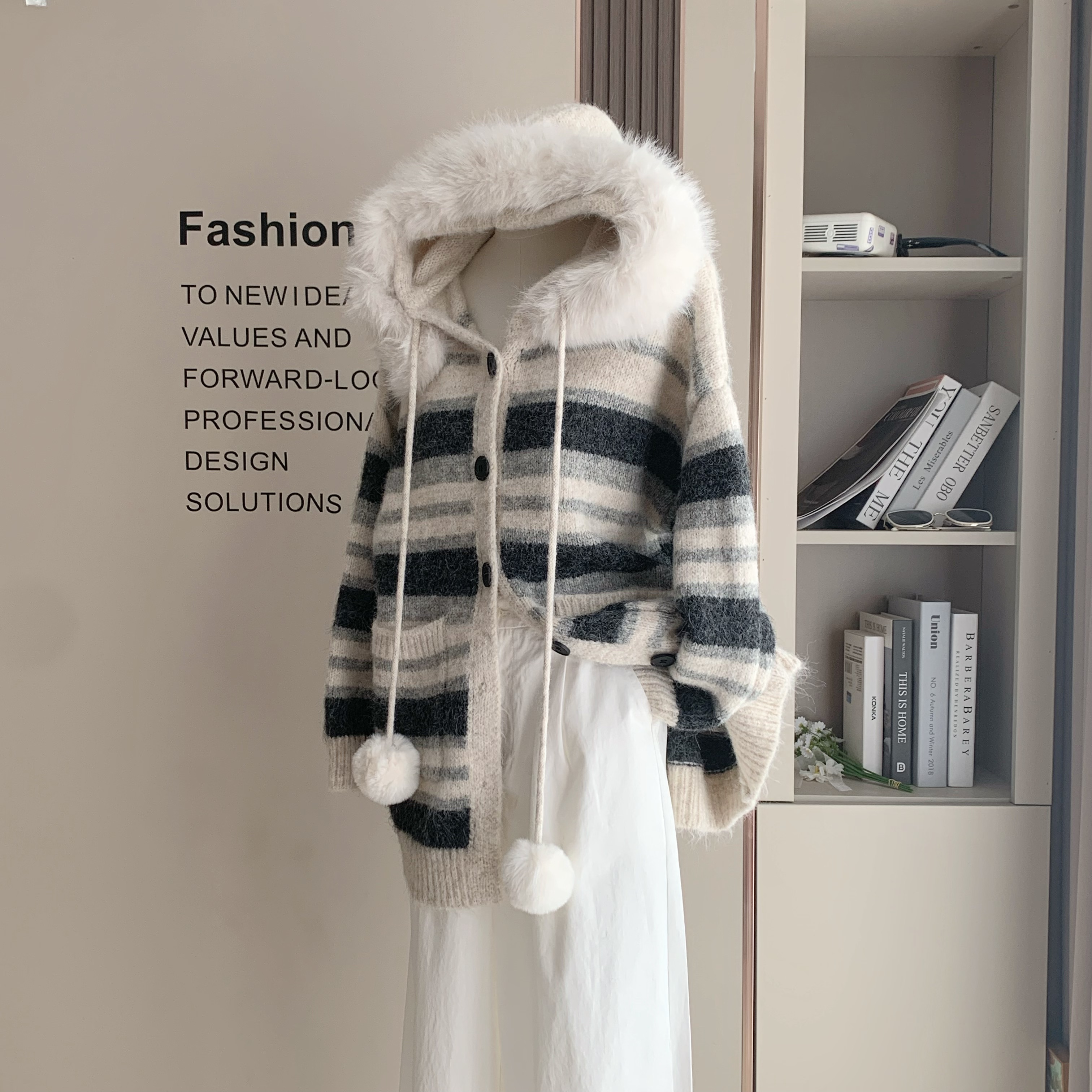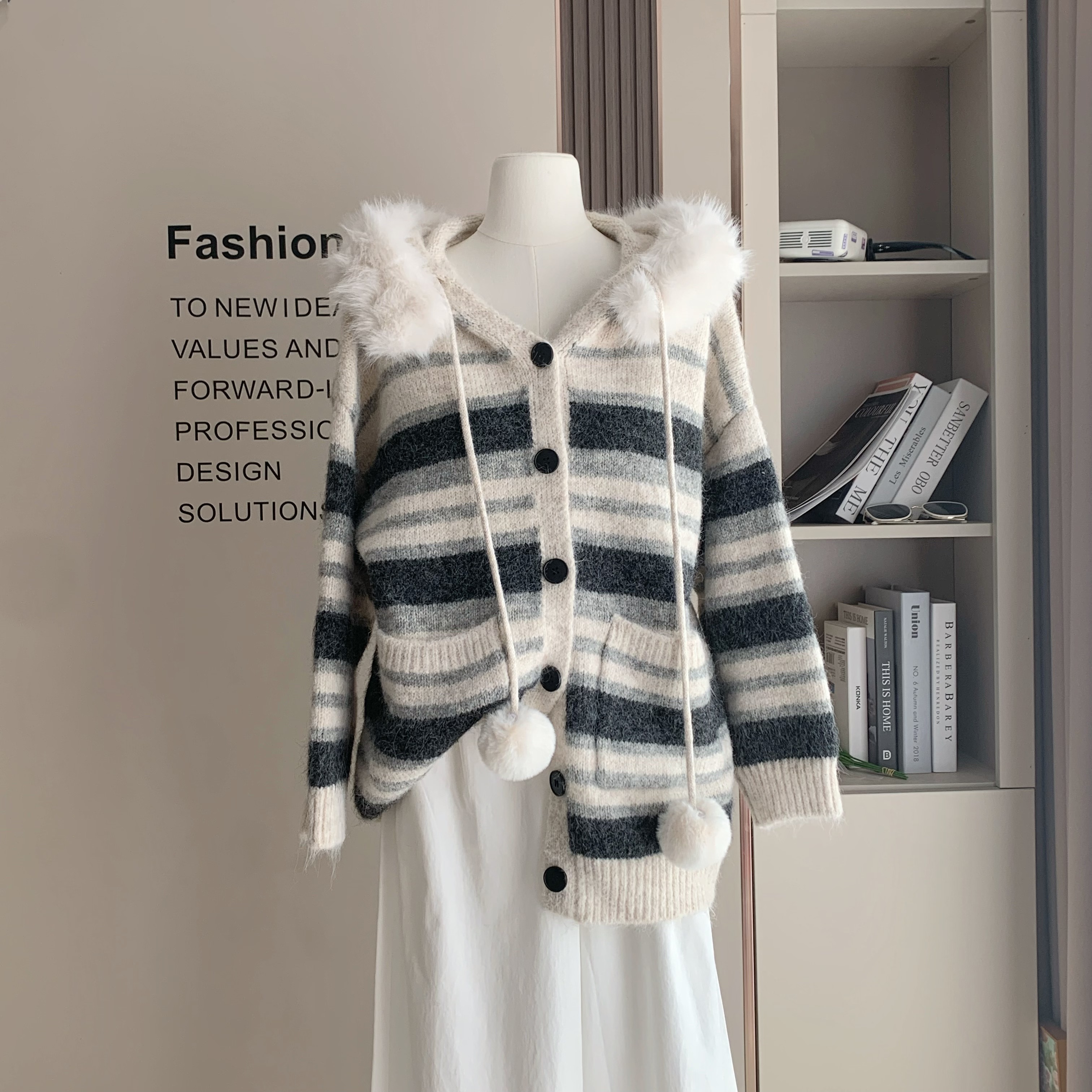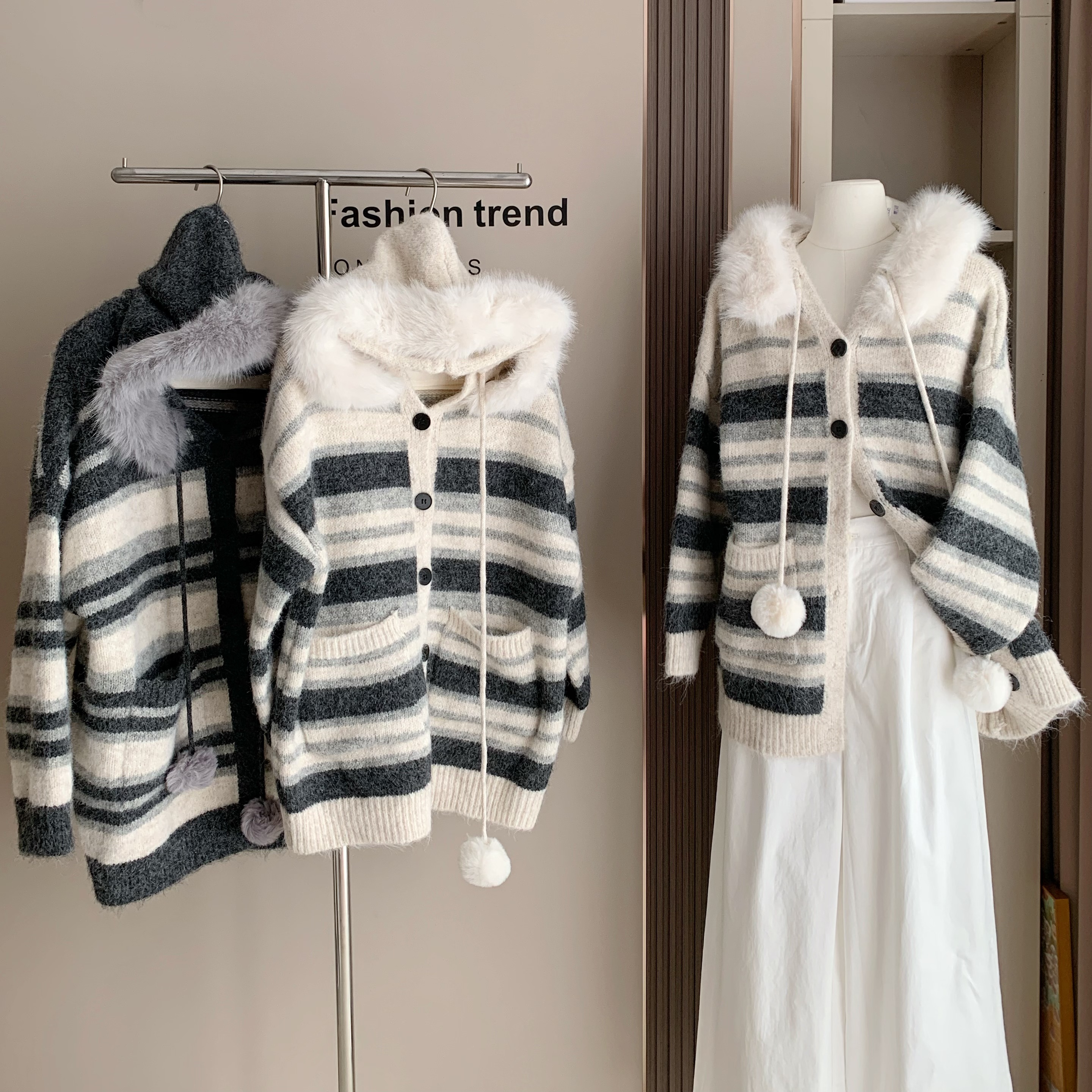 FA51714# 撞色条纹连帽针织开衫女宽松慵懒风中长款毛球毛衣外套 服裝批發女裝批發服飾貨源