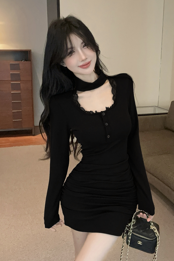 FA51740# 冬款加厚加绒纯欲风方领拼接蕾丝边性感包臀超修身褶皱连衣裙 服裝批發女裝批發服飾貨源