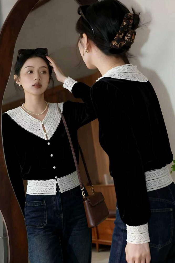 FA51743# 纯欲辣妹蕾丝拼接丝绒打底衬衫女高级感小众v领长袖短款上衣 服裝批發女裝批發服飾貨源