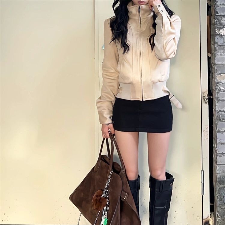 FA51778# 复古鹿皮绒立领长袖夹克外套女秋季美式机车服宽松设计感气质上衣 服裝批發女裝批發服飾貨源