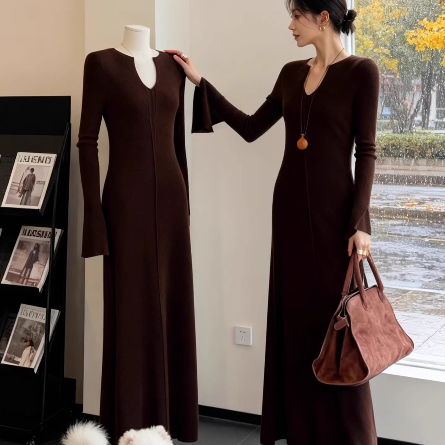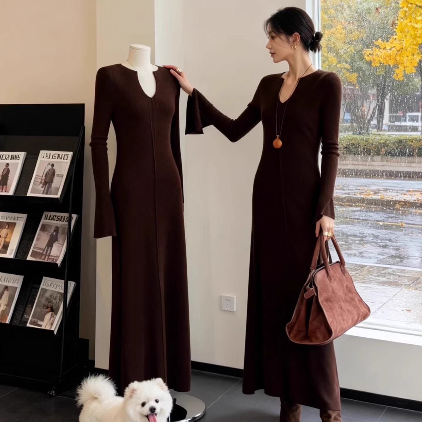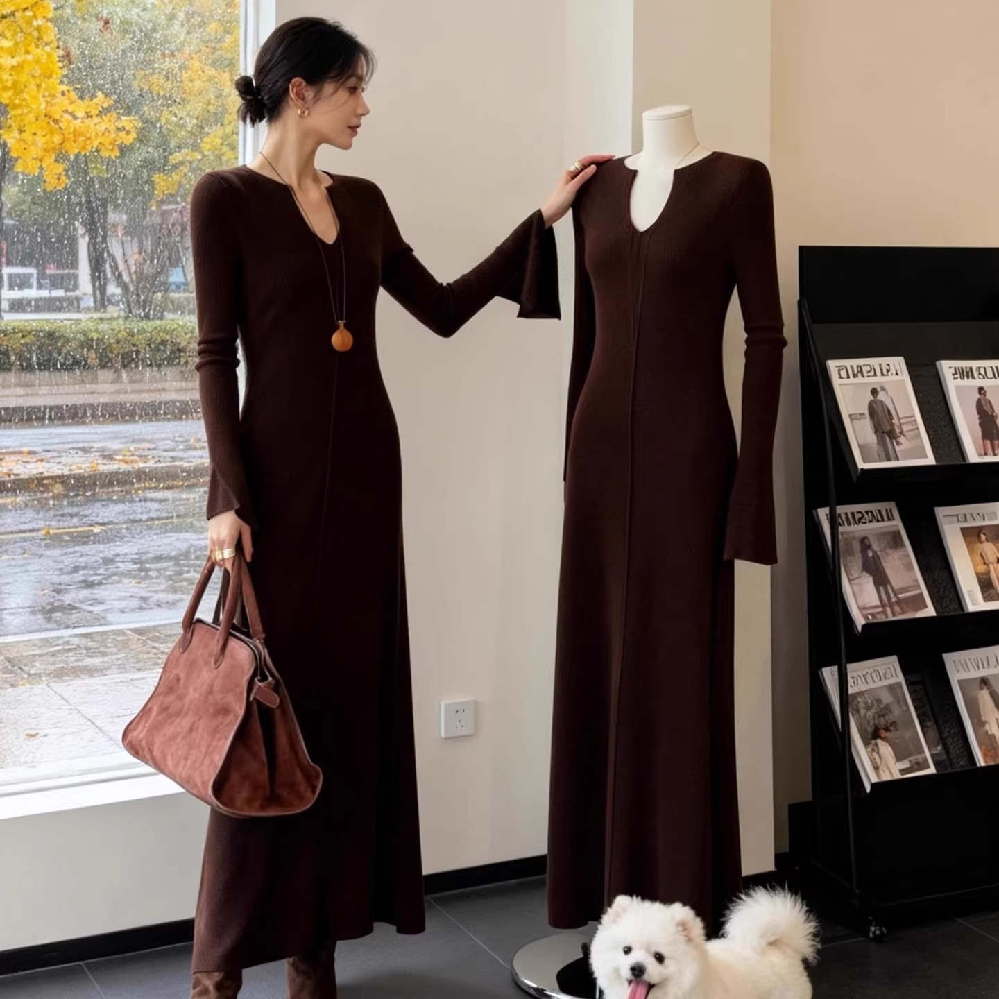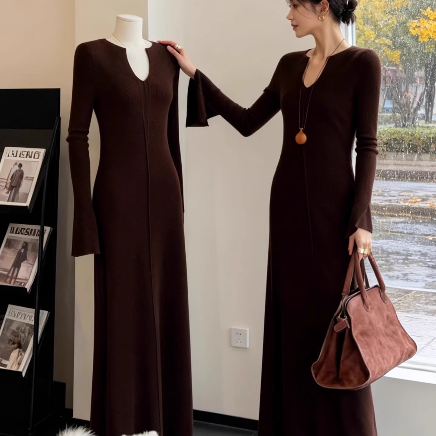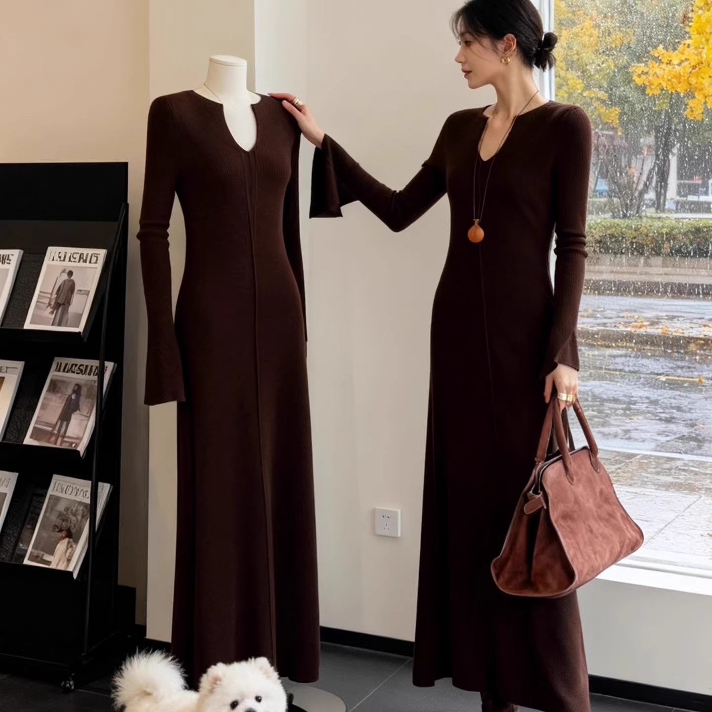 FA51920# 赫本风高级感气质v领针织连衣裙子女秋冬配大衣修身内搭打底长裙 服裝批發女裝批發服飾貨源