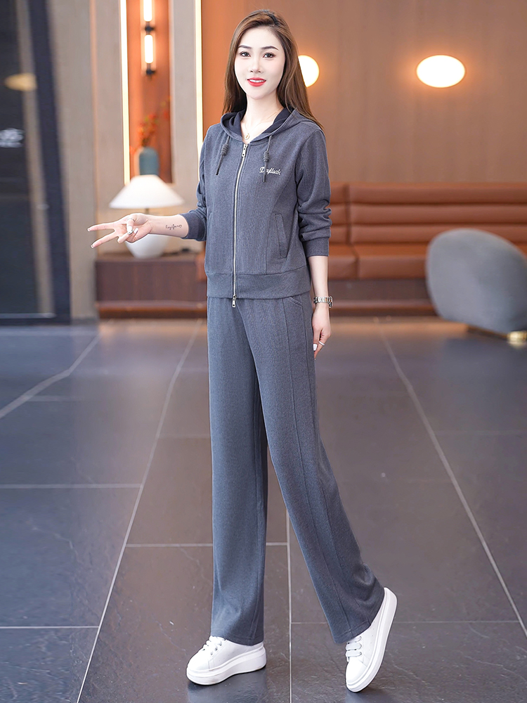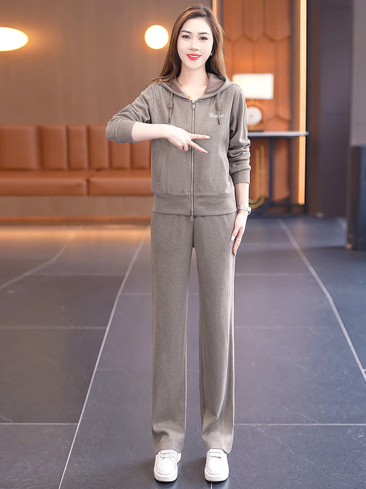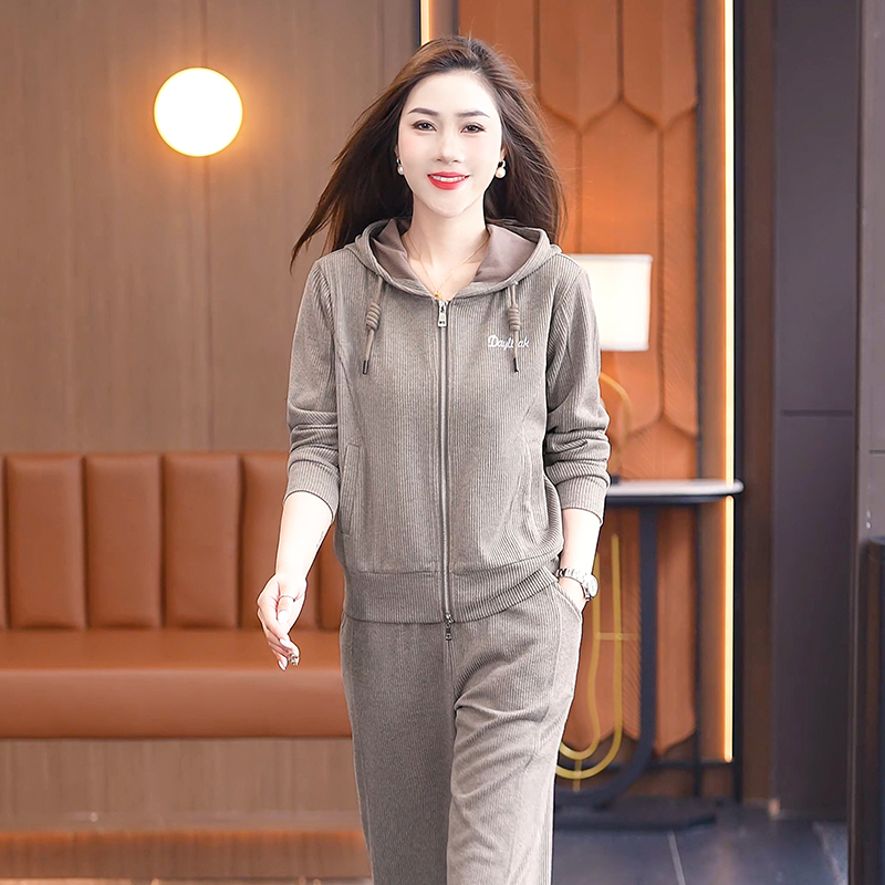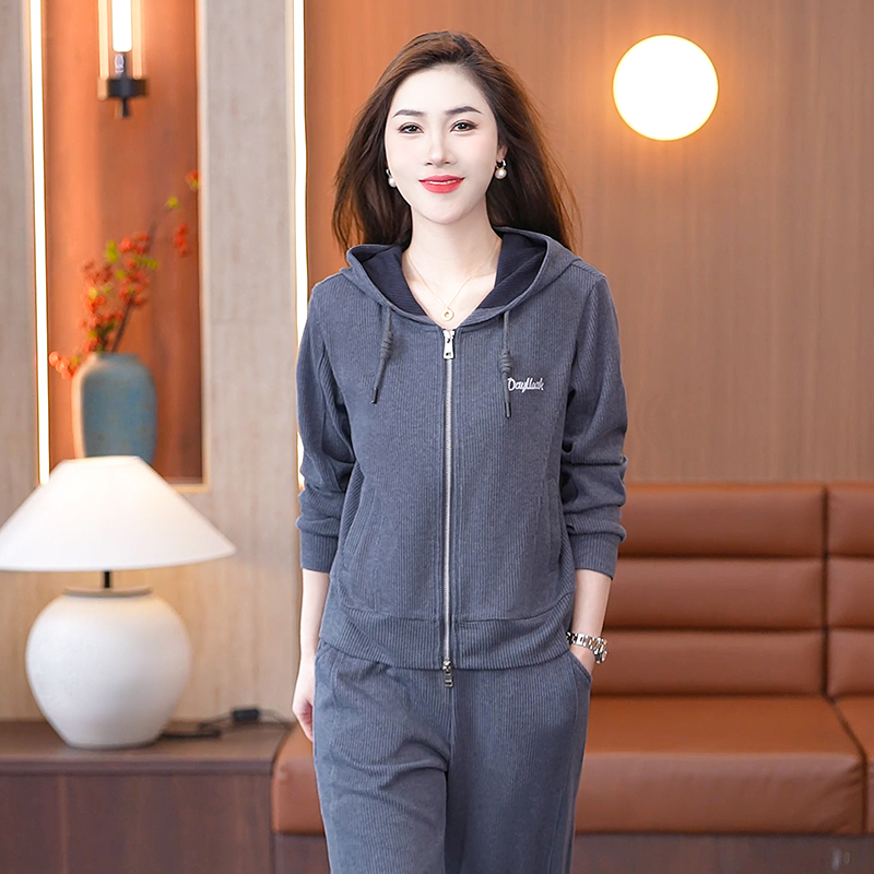 FA52276# 新款高级感条绒运动服套装女春秋减龄外套连帽卫衣潮牌休闲两件套 服裝批發女裝批發服飾貨源