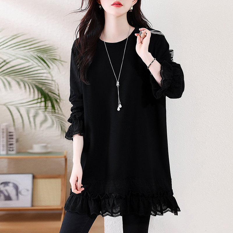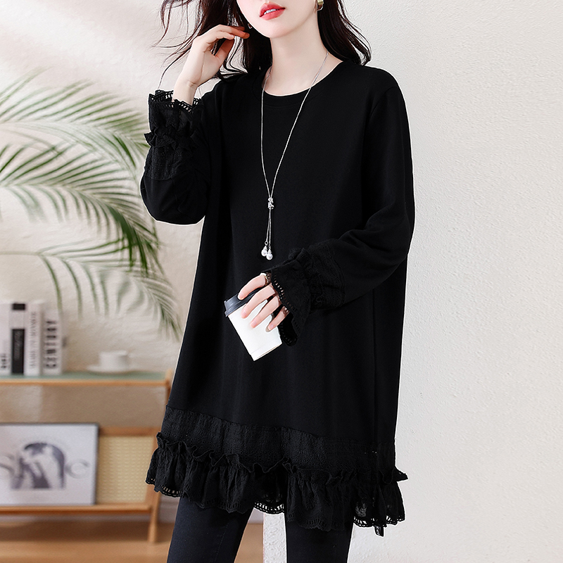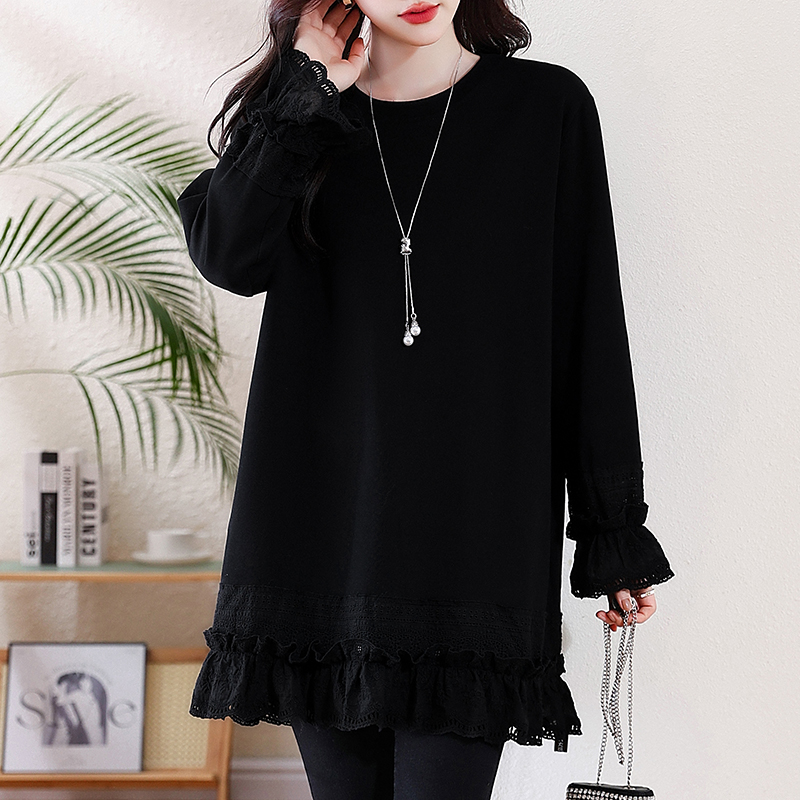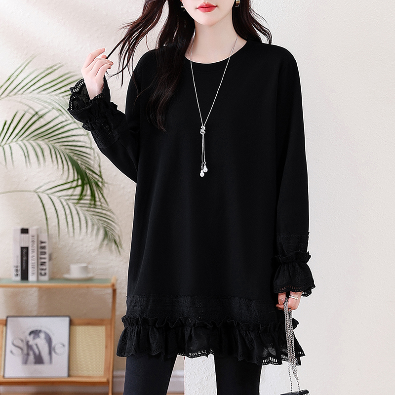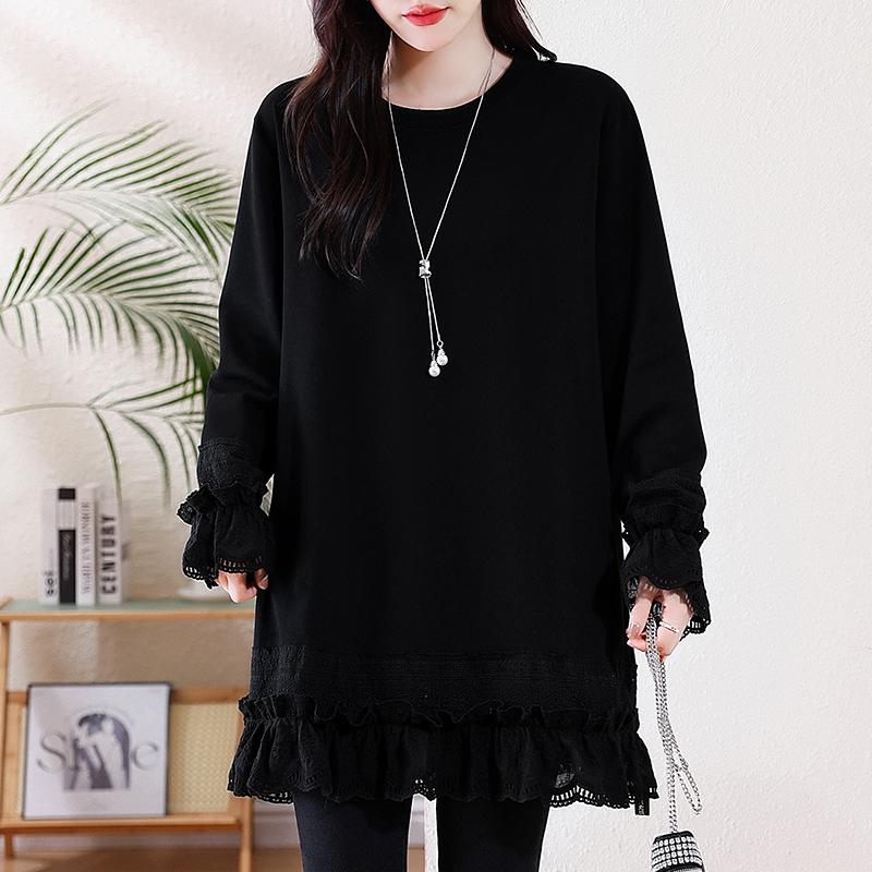 FA52331# 秋冬新款圆领拼接刺绣蕾丝边宽松遮肉大码中长款长袖卫衣 服裝批發女裝批發服飾貨源