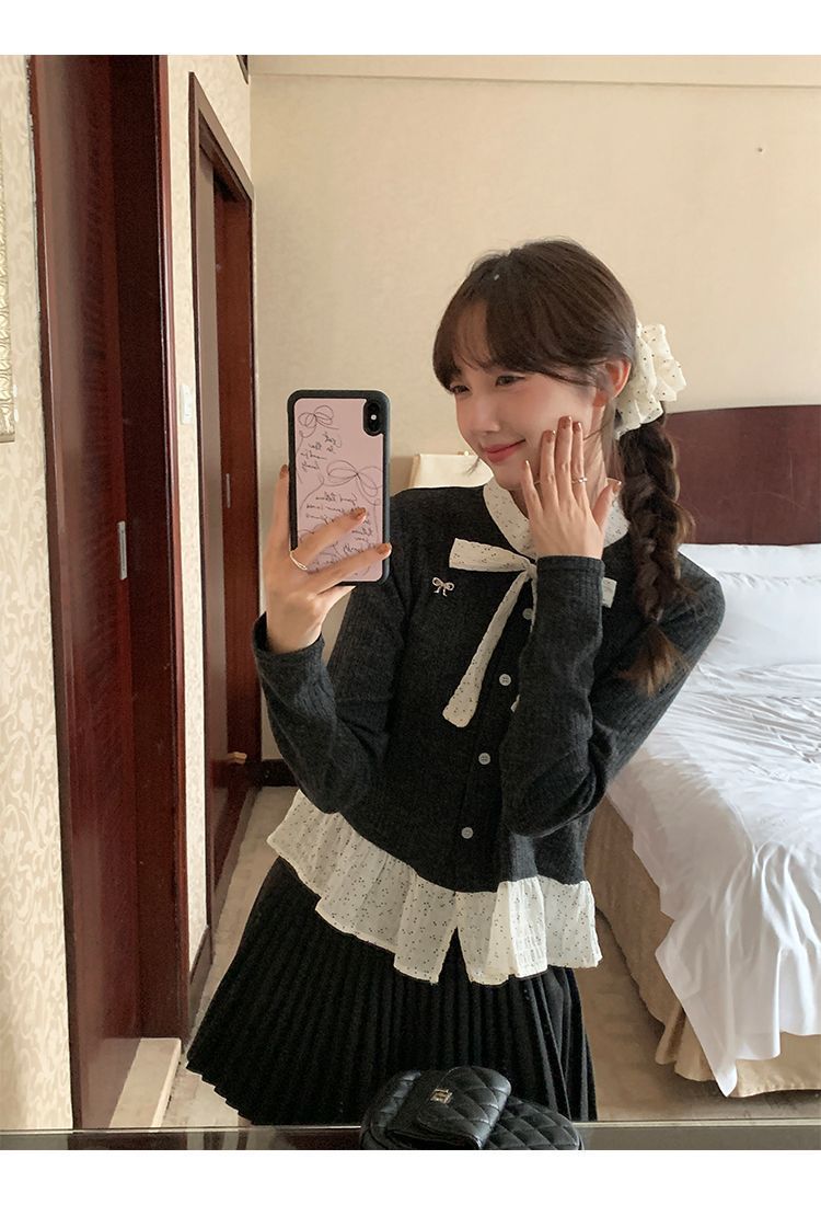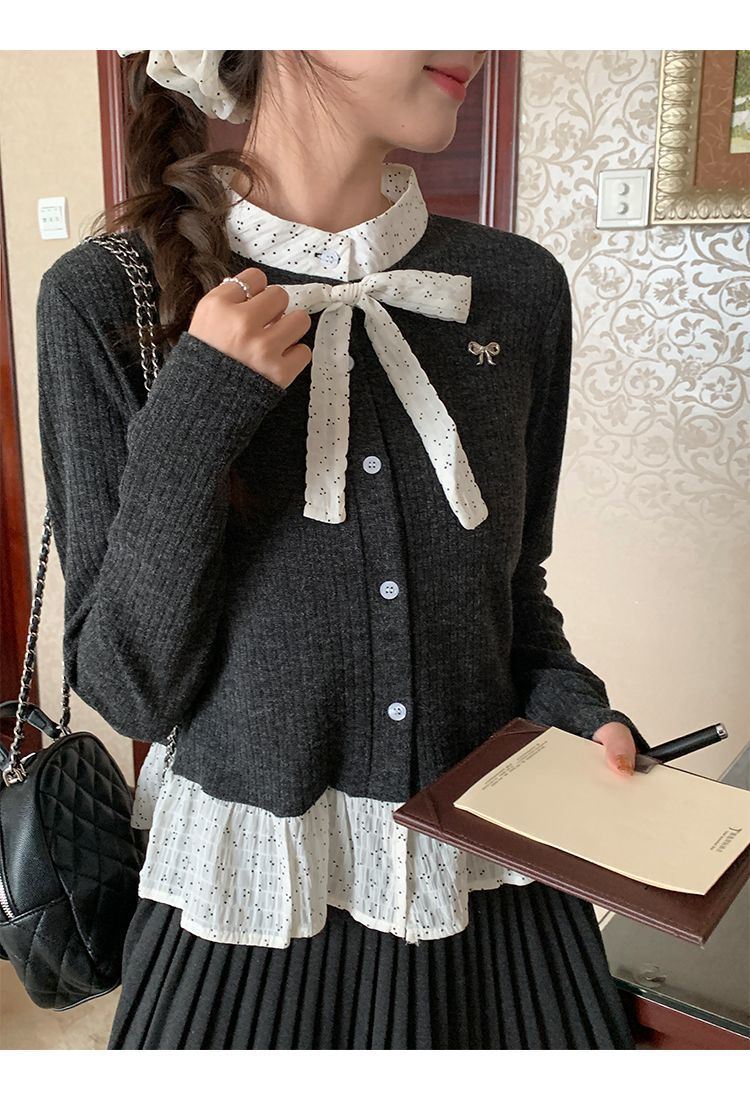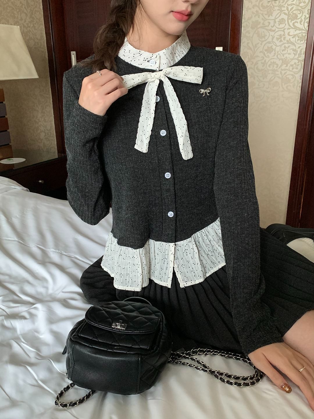 FA52373# 高级感黑色波点荷叶边拼接假两件长袖女立体蝴蝶结针织开衫外套 服裝批發女裝批發服飾貨源