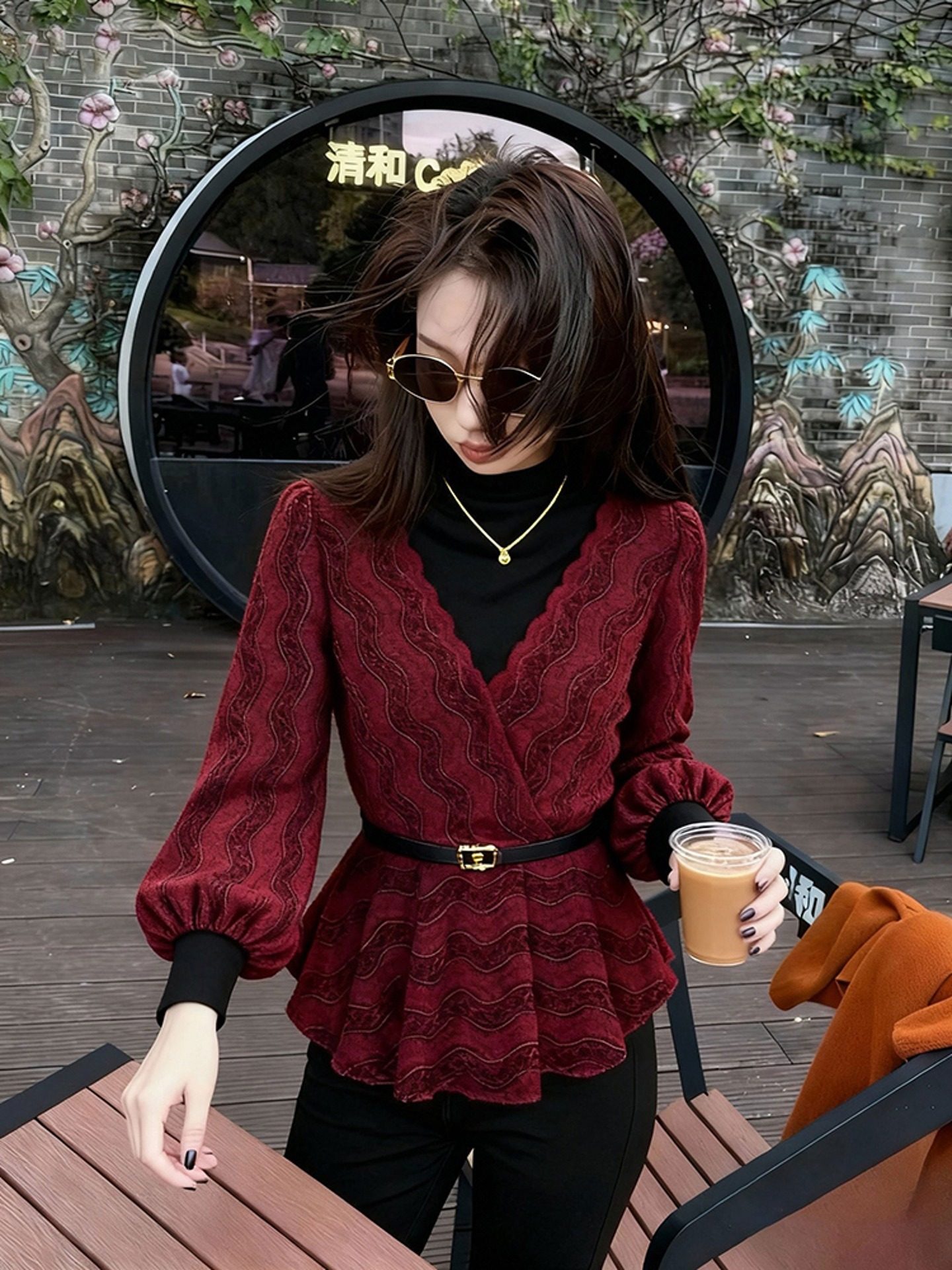 FA52388# 独特漂亮新款小衫女冬巨好看设计感气质高端掐腰酒红色假两件上 服裝批發女裝批發服飾貨源