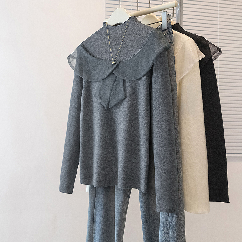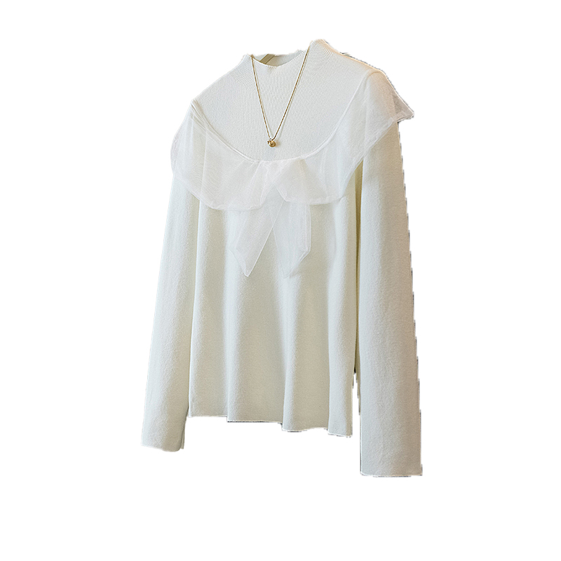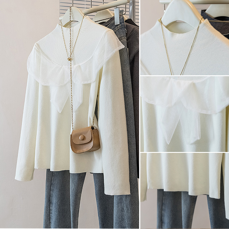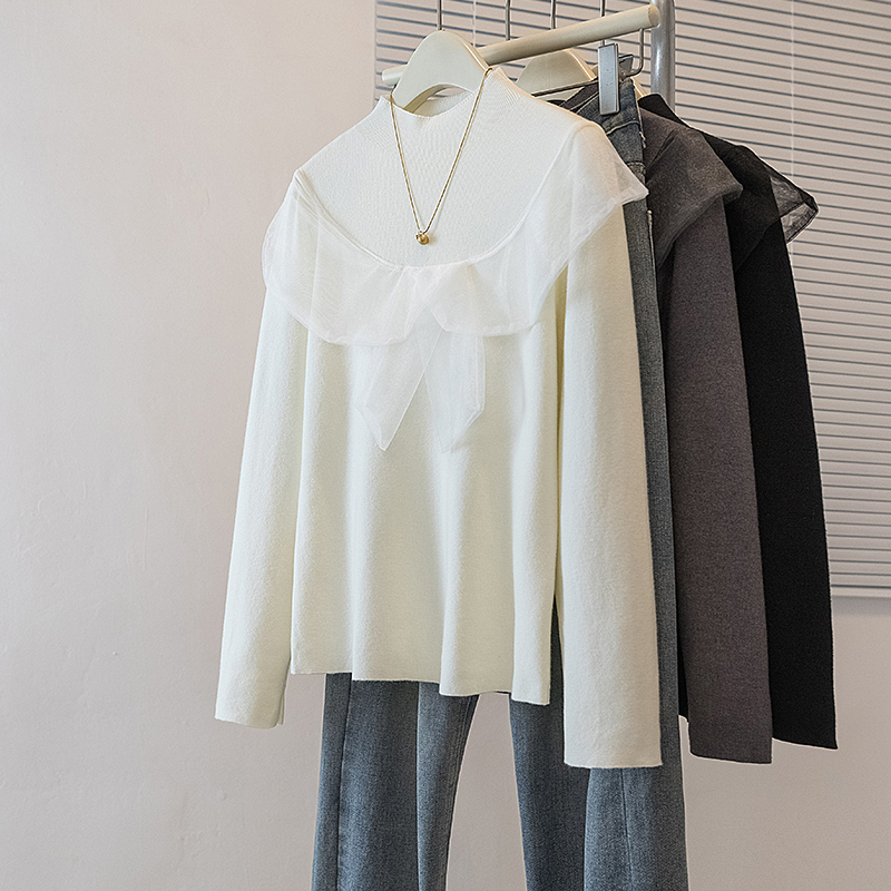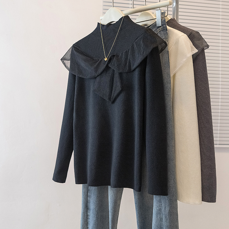 FA52399# 大码女装秋冬新款韩网纱荷叶边蝴蝶结气质百搭显瘦针织衫上衣 服裝批發女裝批發服飾貨源