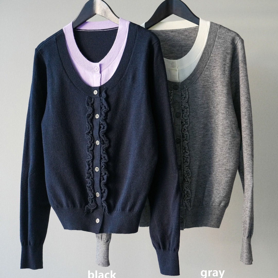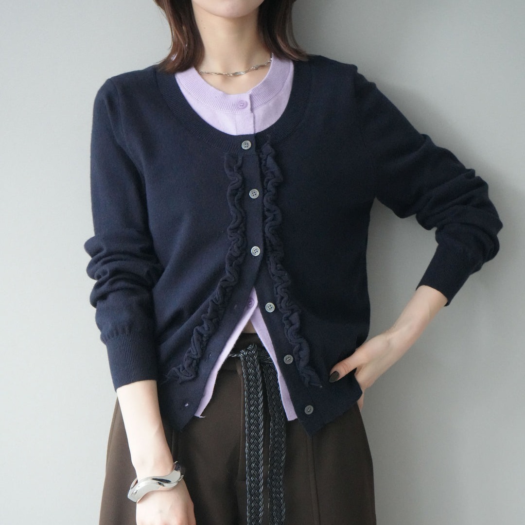 FA52413# 春秋新款木耳边气质门襟花边拼色假两件针织开衫女针织上衣 服裝批發女裝批發服飾貨源