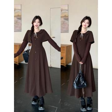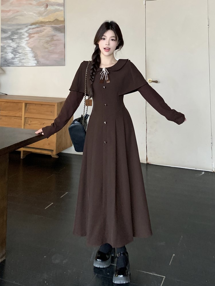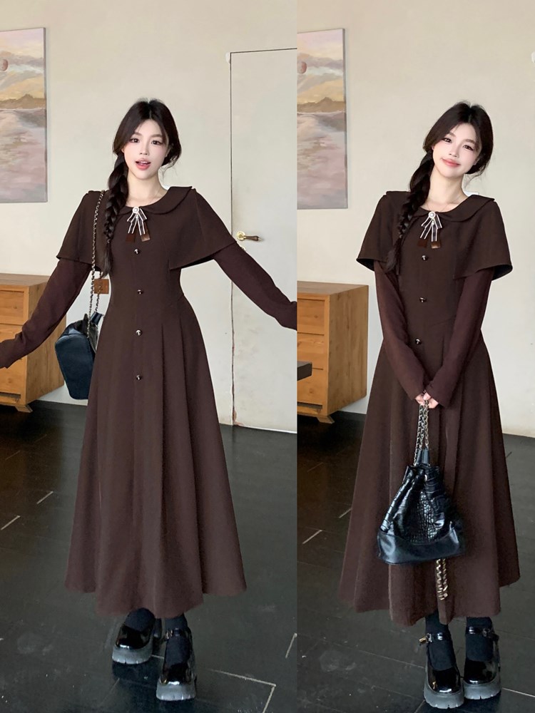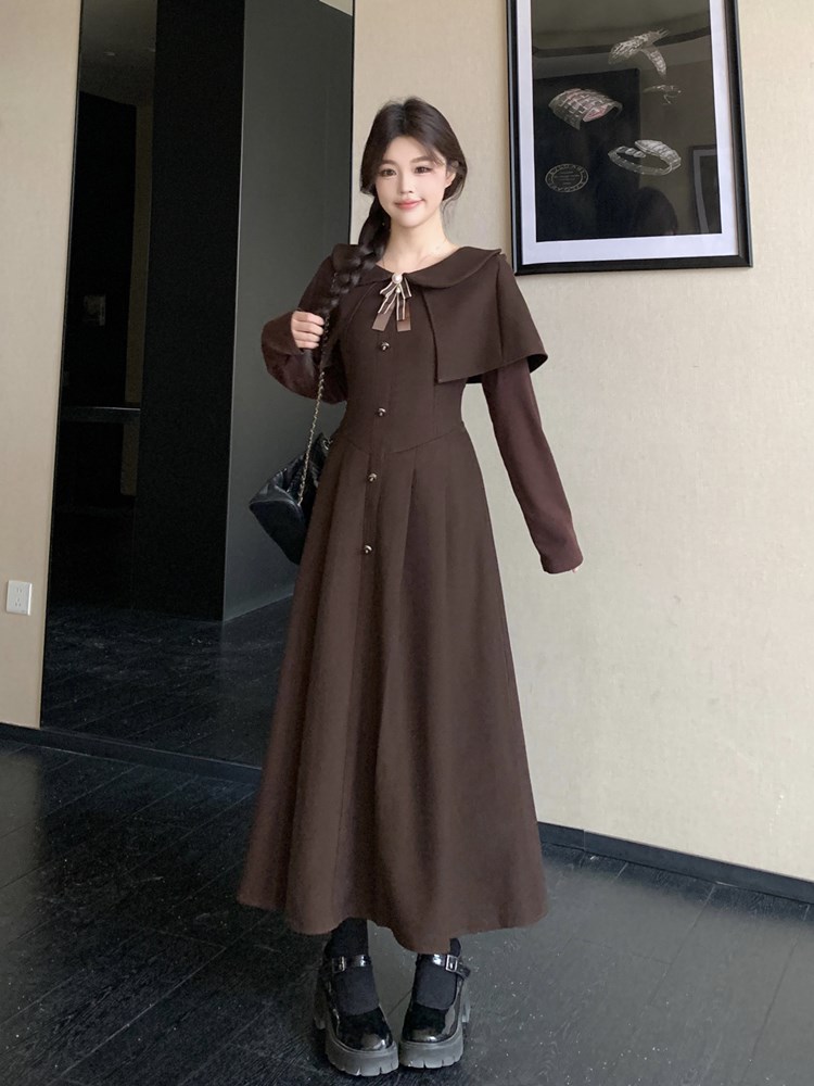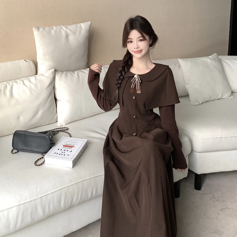 FA52440# 韩系复古斗篷披肩连衣裙女春秋胖mm学院风高级感显瘦长裙子