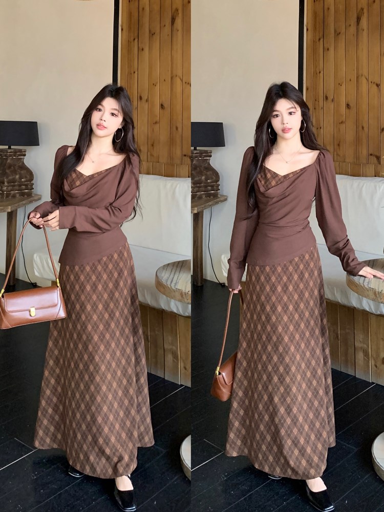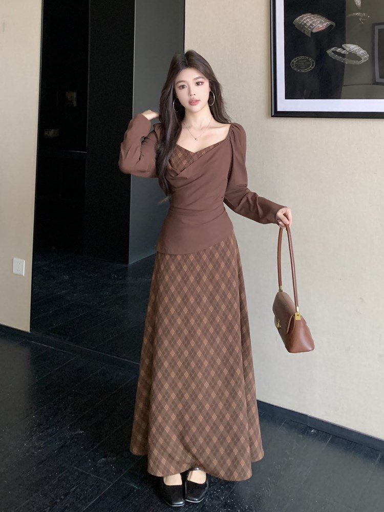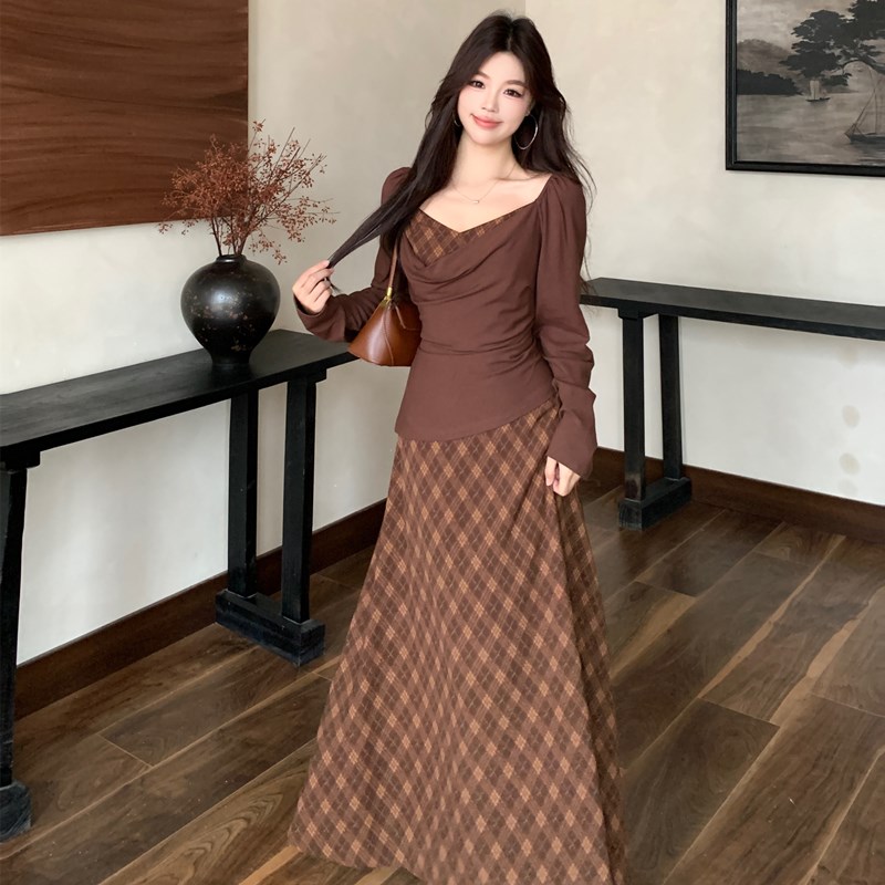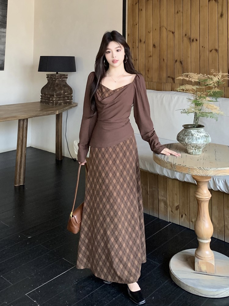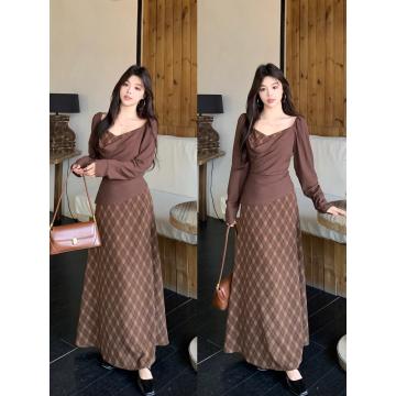 FA52441# 春秋新款港风复古修身显瘦胖mm设计感针织拼接连衣裙长裙子女