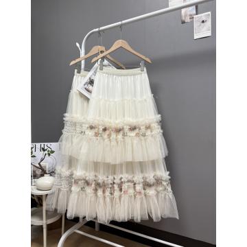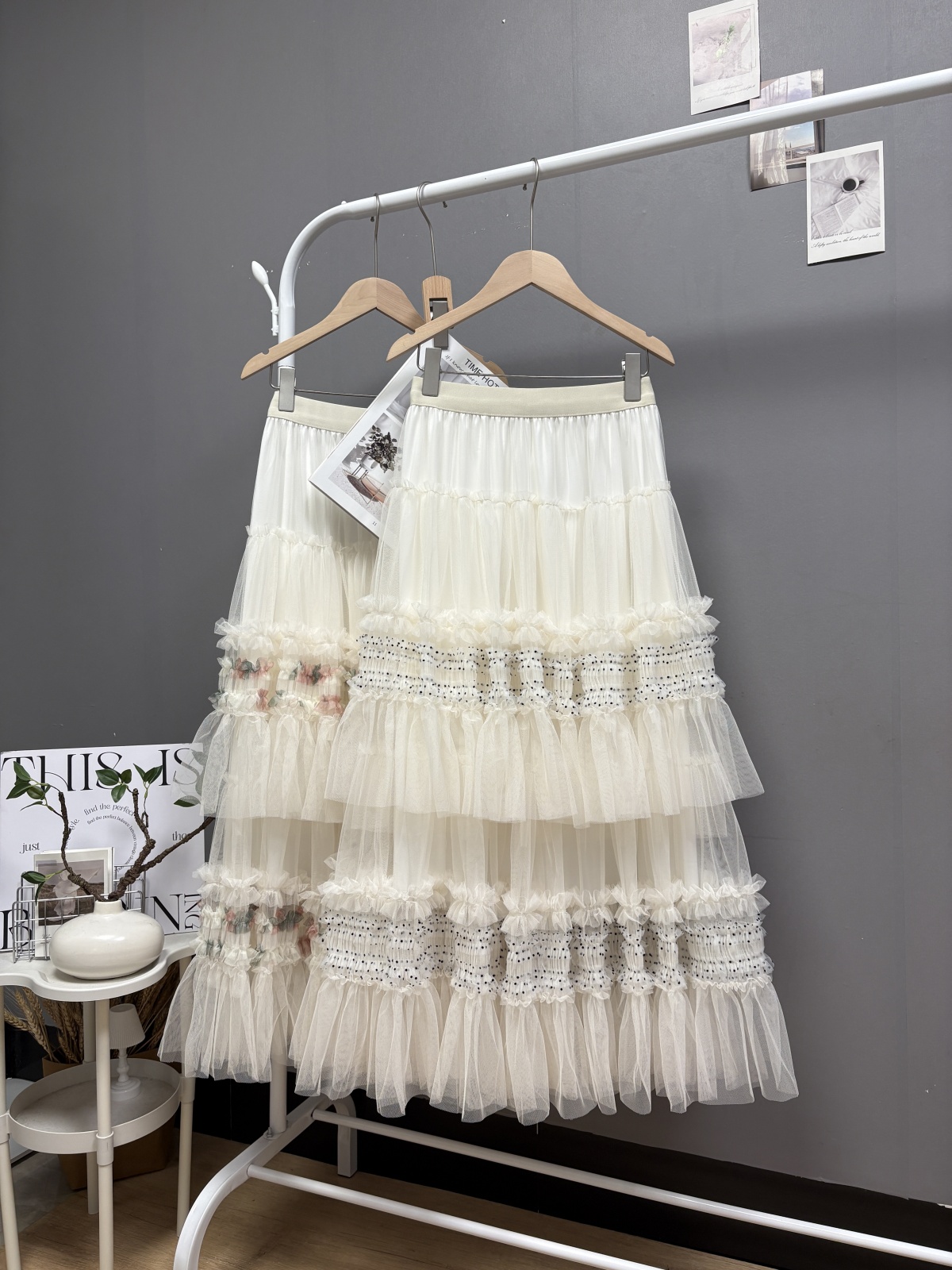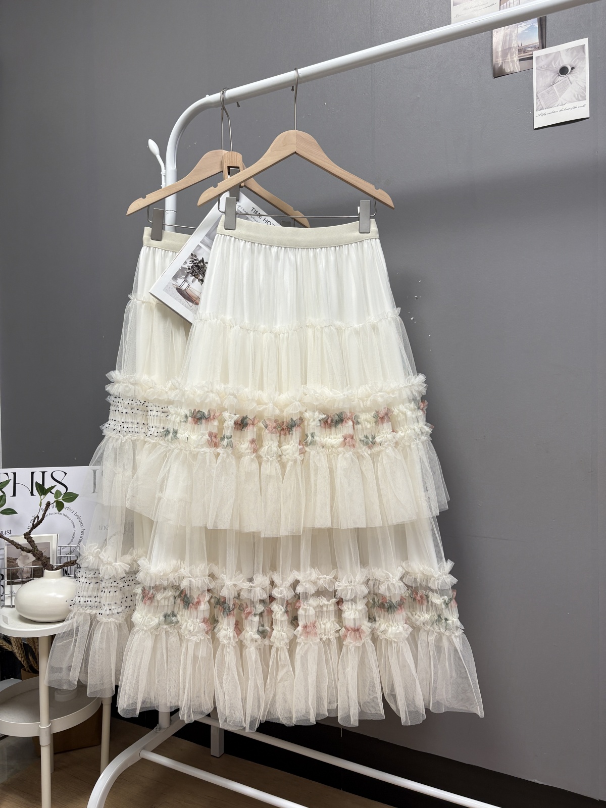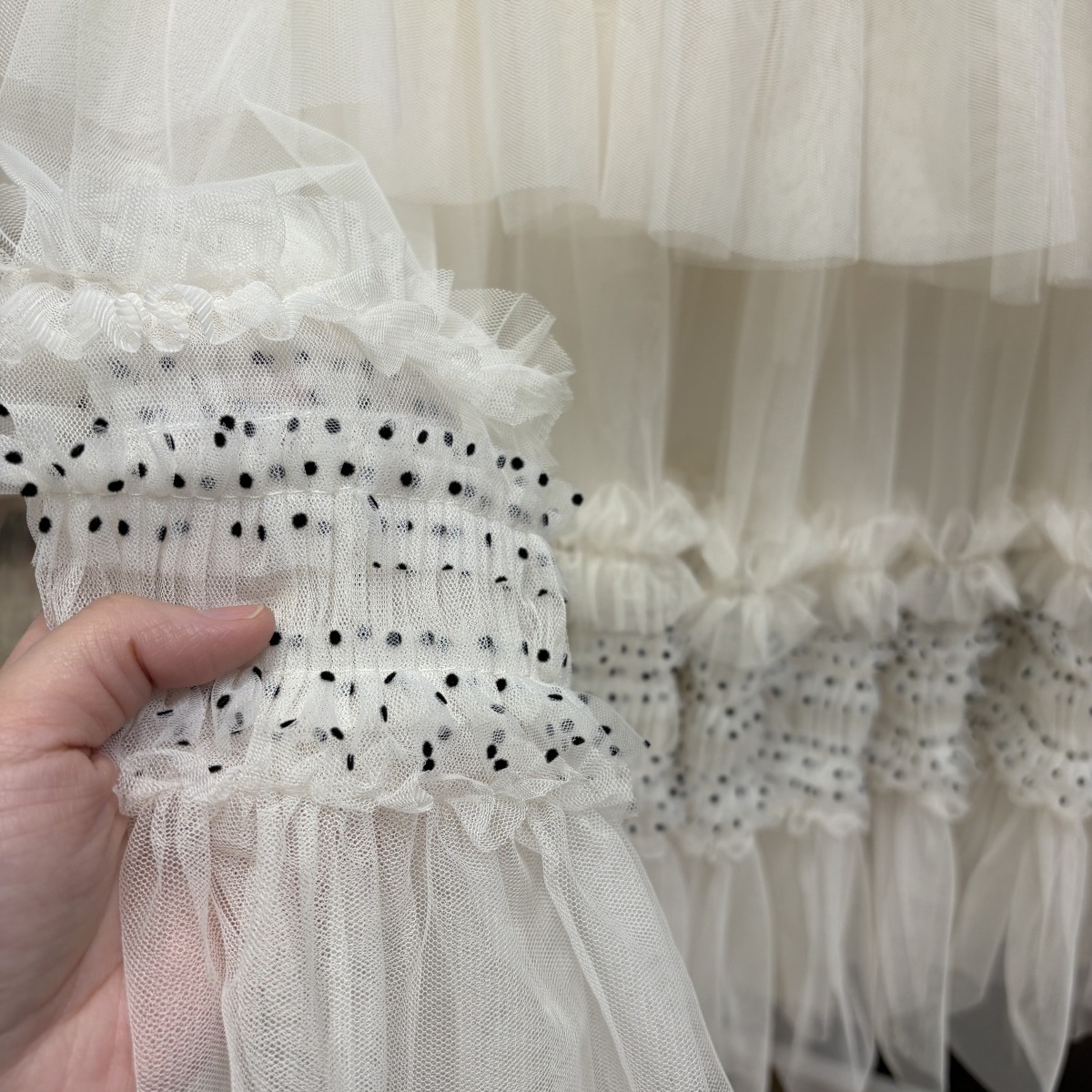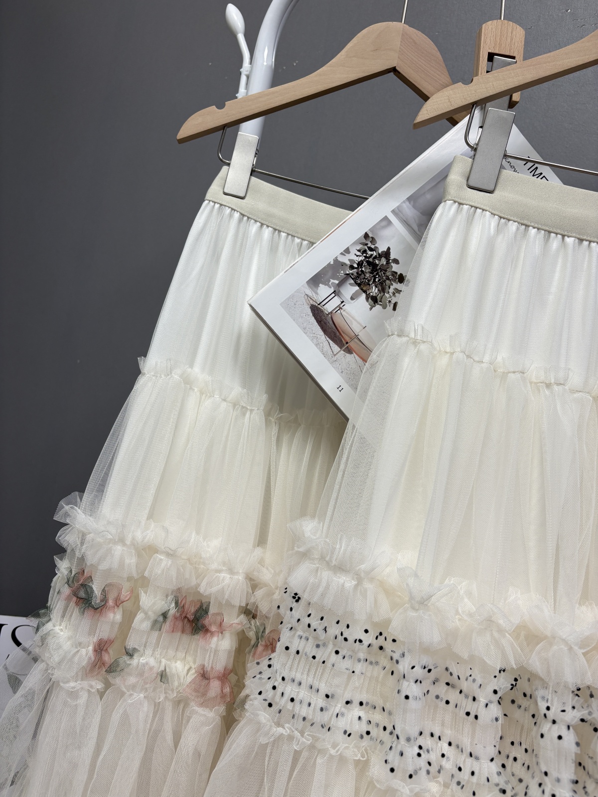 法式新款重工木耳边拼接波点蛋糕裙长款超仙绝美纱裙半身裙