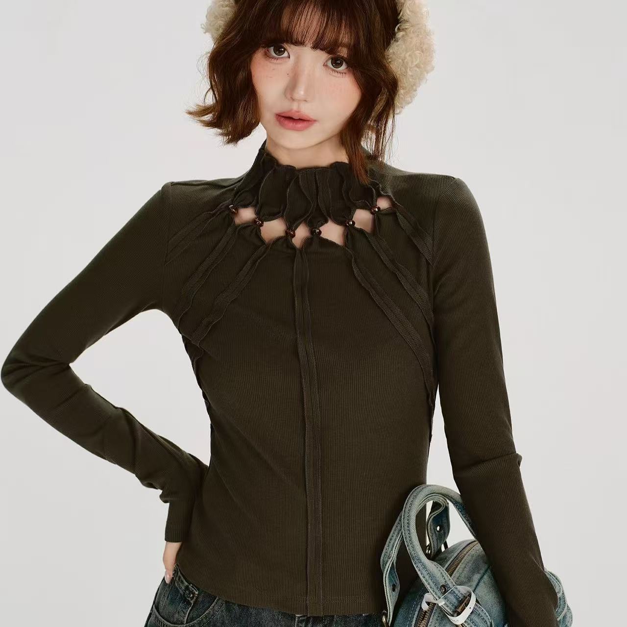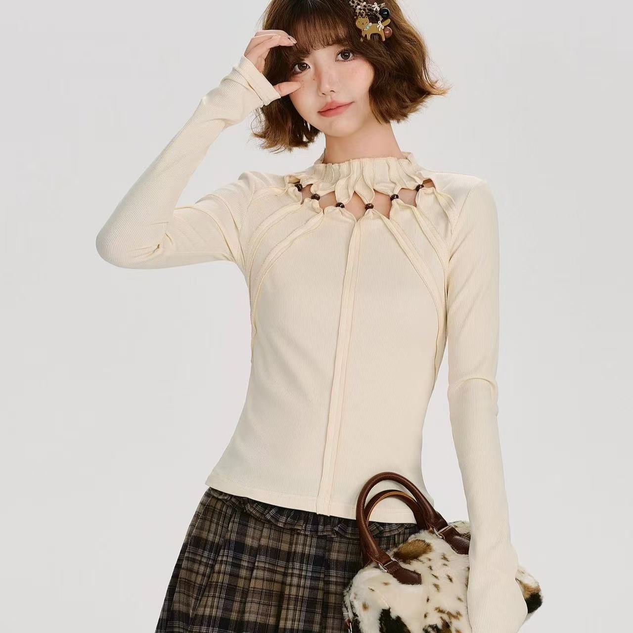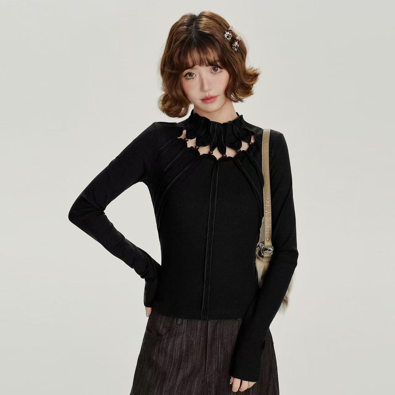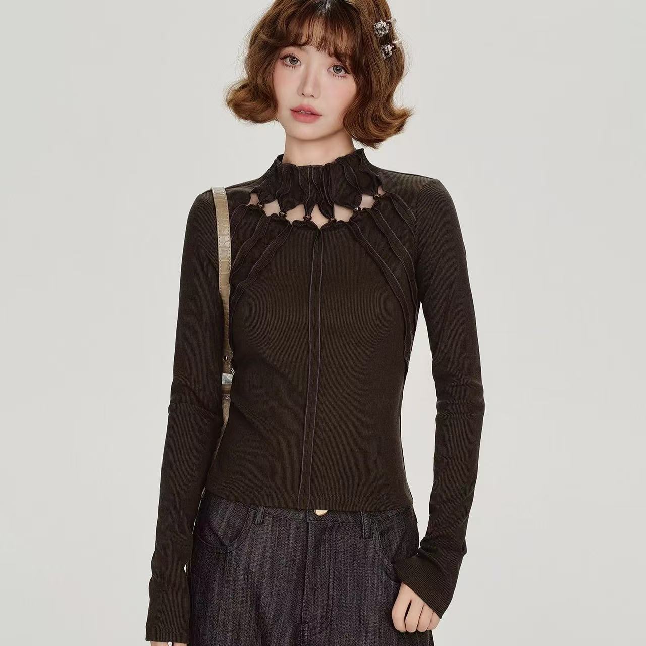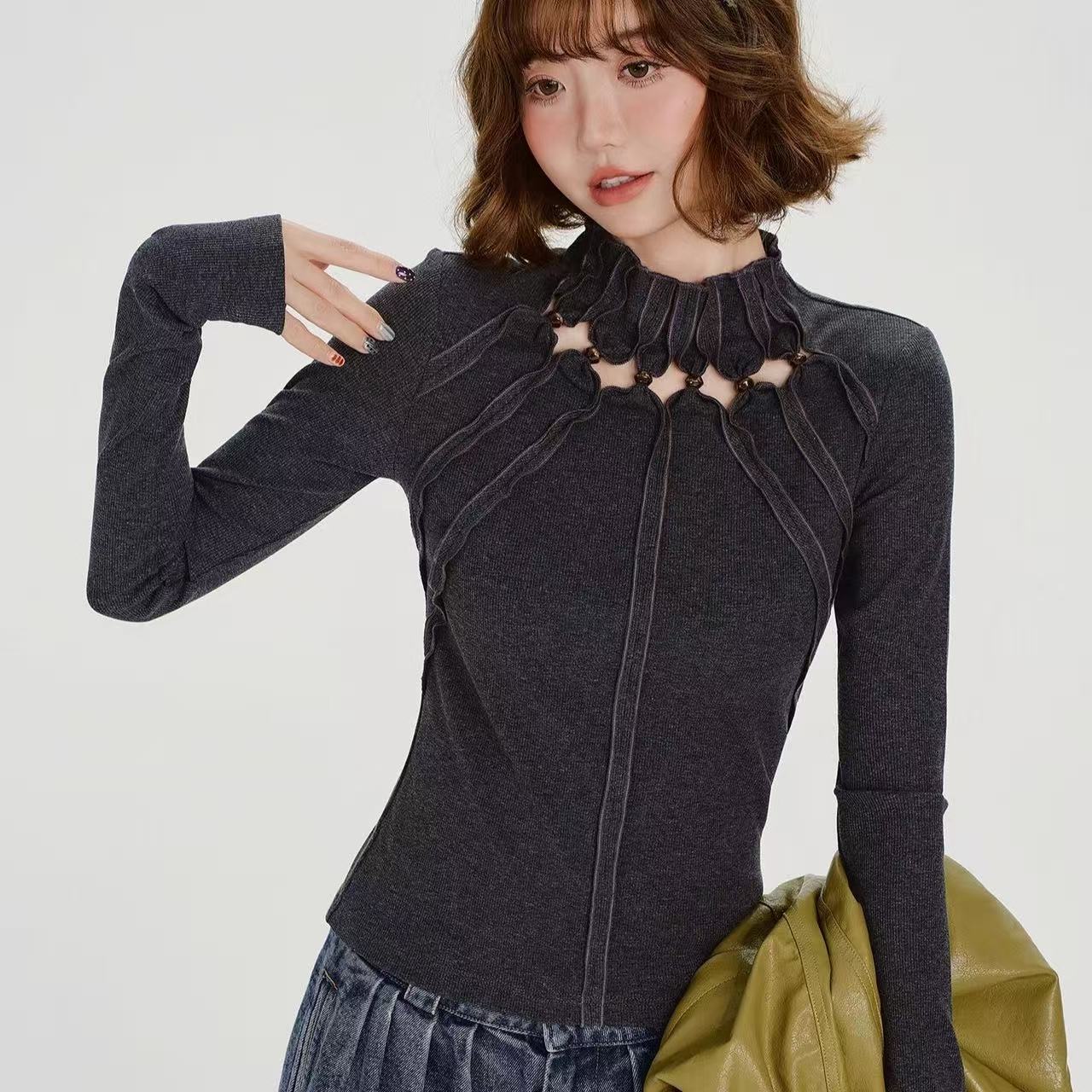 FA52546# 大码爆款美式复古辣妹镂空长袖t恤女春秋新款设计感修身显瘦上衣 服裝批發女裝批發服飾貨源