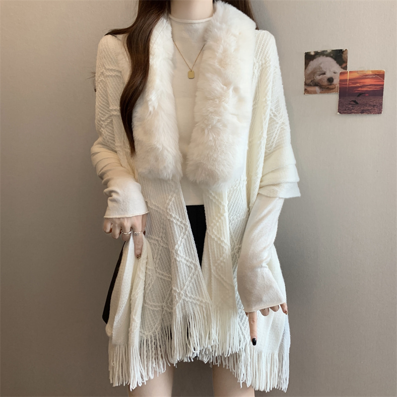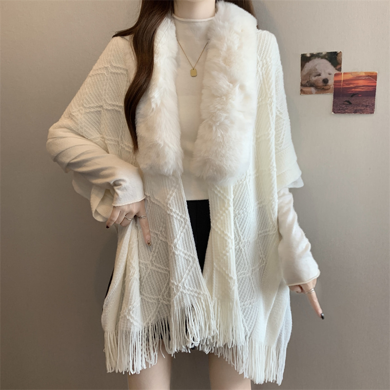 FA52587# 大码胖MM设计感慵懒风毛领外搭披肩流苏斗篷针织衫 服裝批發女裝批發服飾貨源