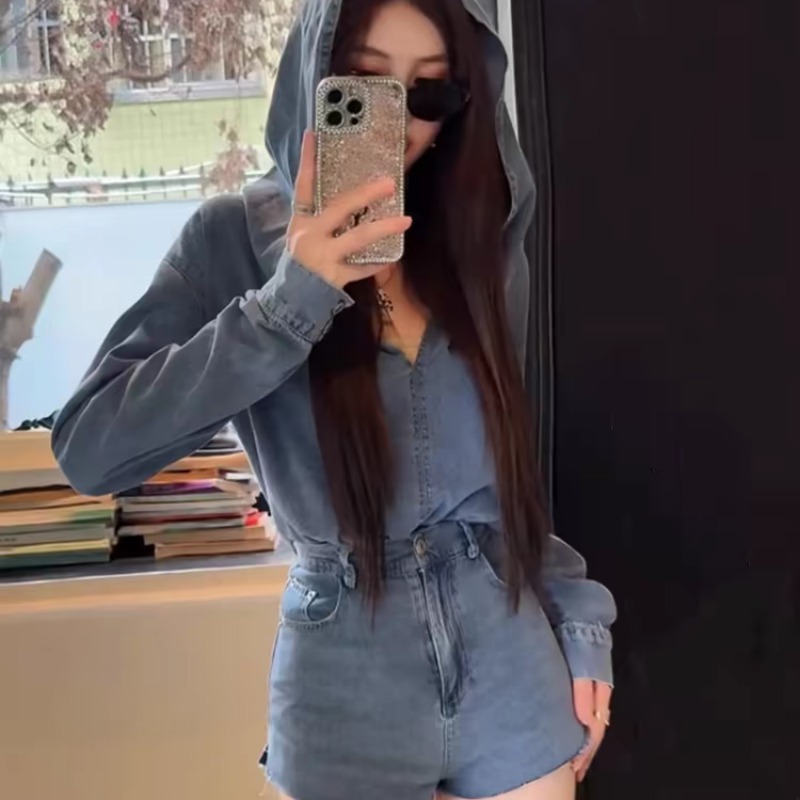 FA52731# 美式复古蓝色牛仔连帽短上衣套装女早秋小个子高腰显瘦短裤两件套 服裝批發女裝批發服飾貨源