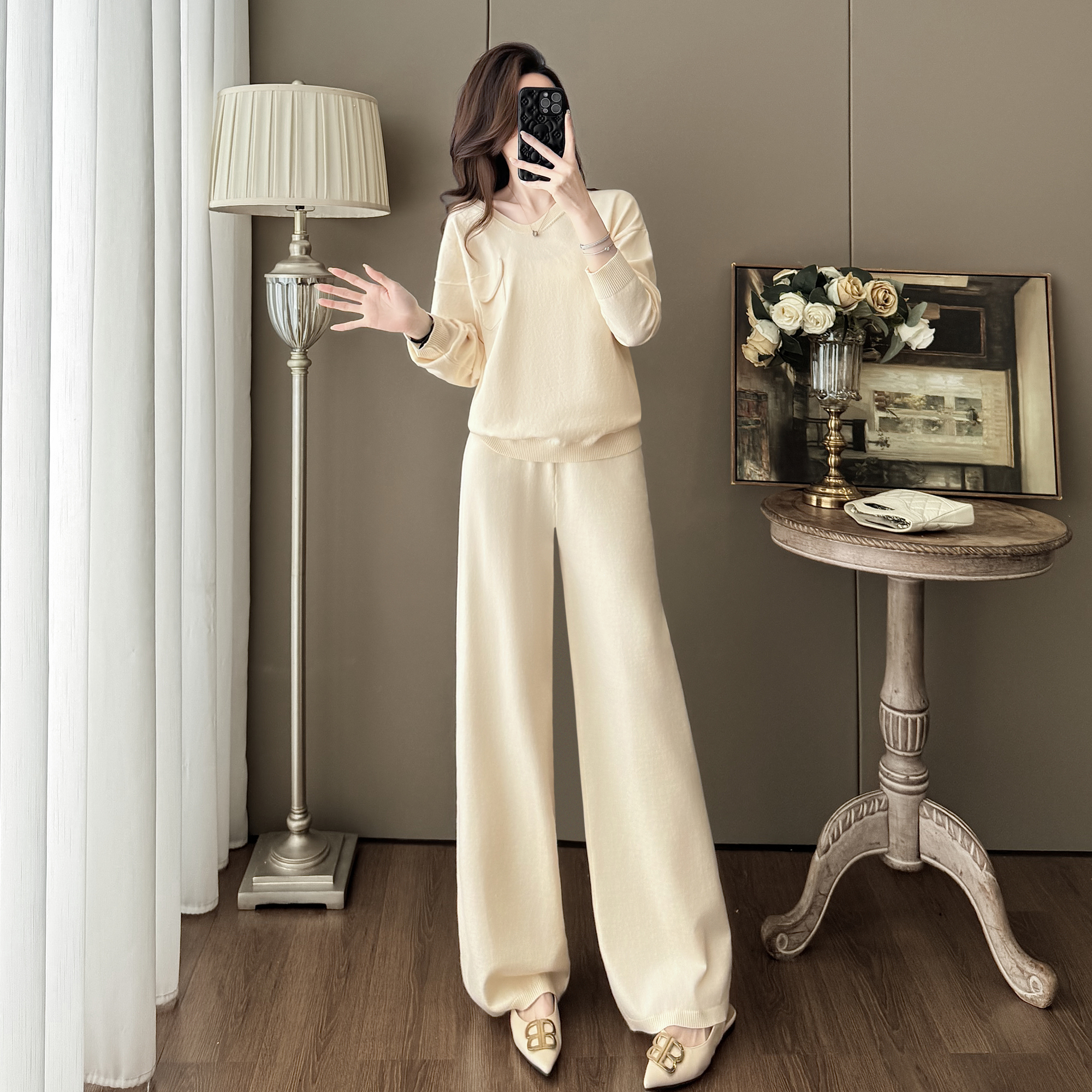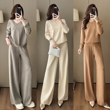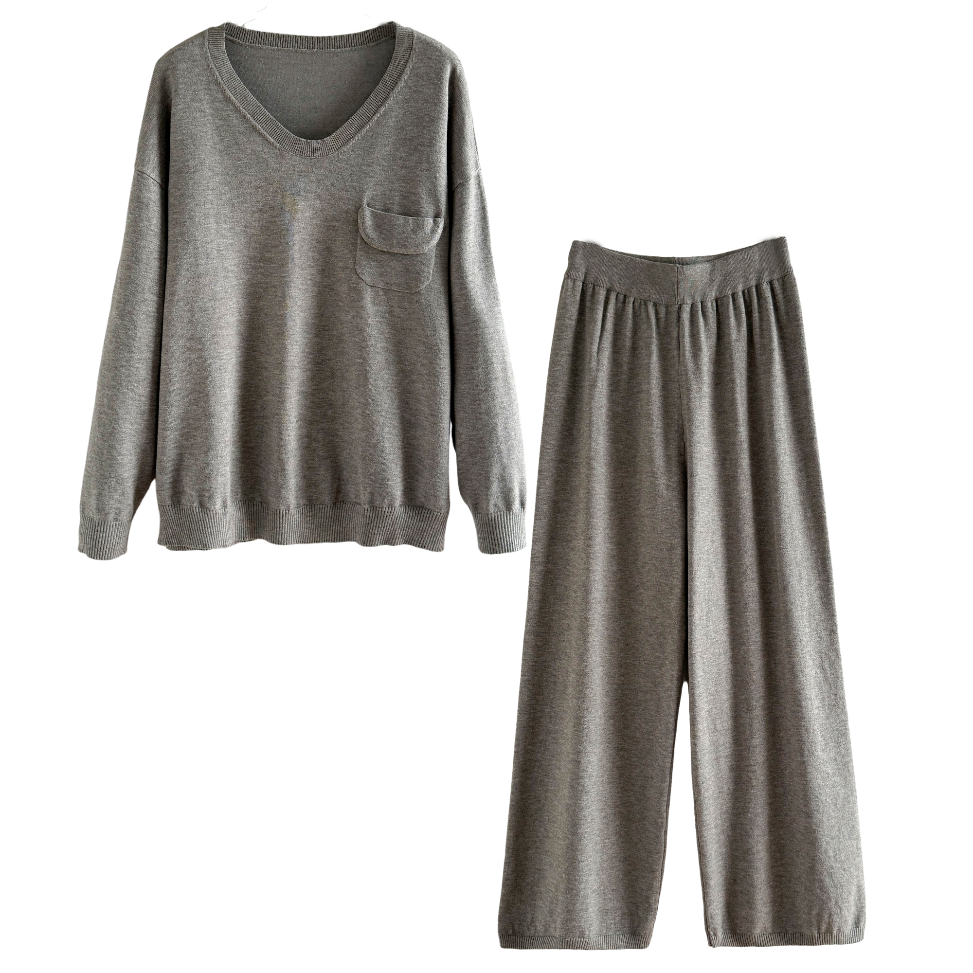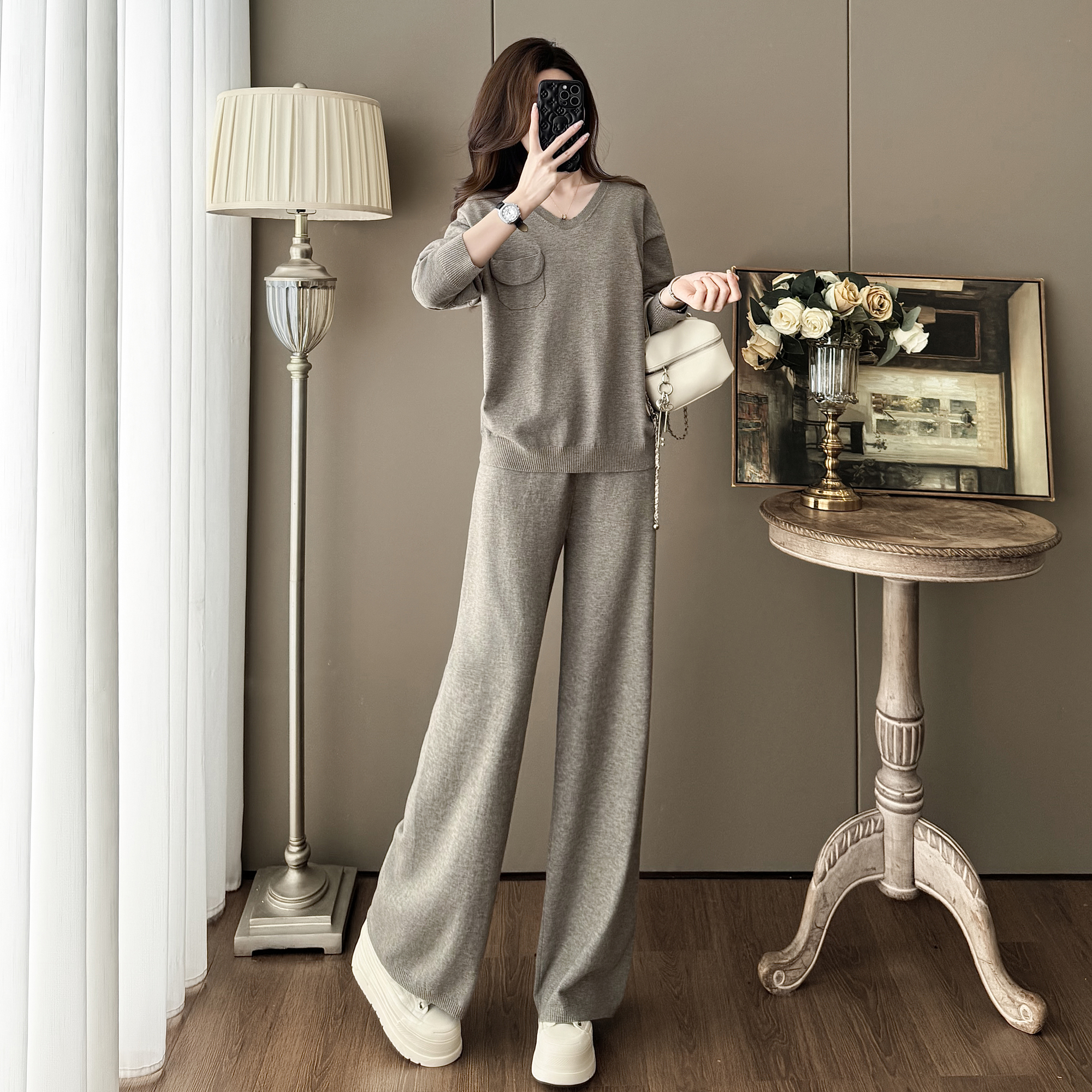 FA52831# 休闲慵懒风松驰感懒人针织套装秋季新款U领口袋毛衣阔腿裤两件套 服裝批發女裝批發服飾貨源