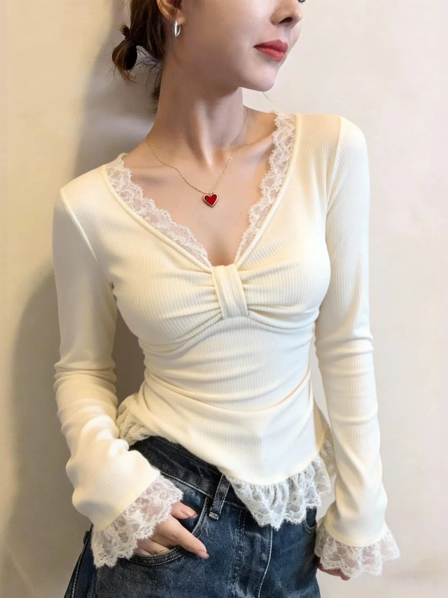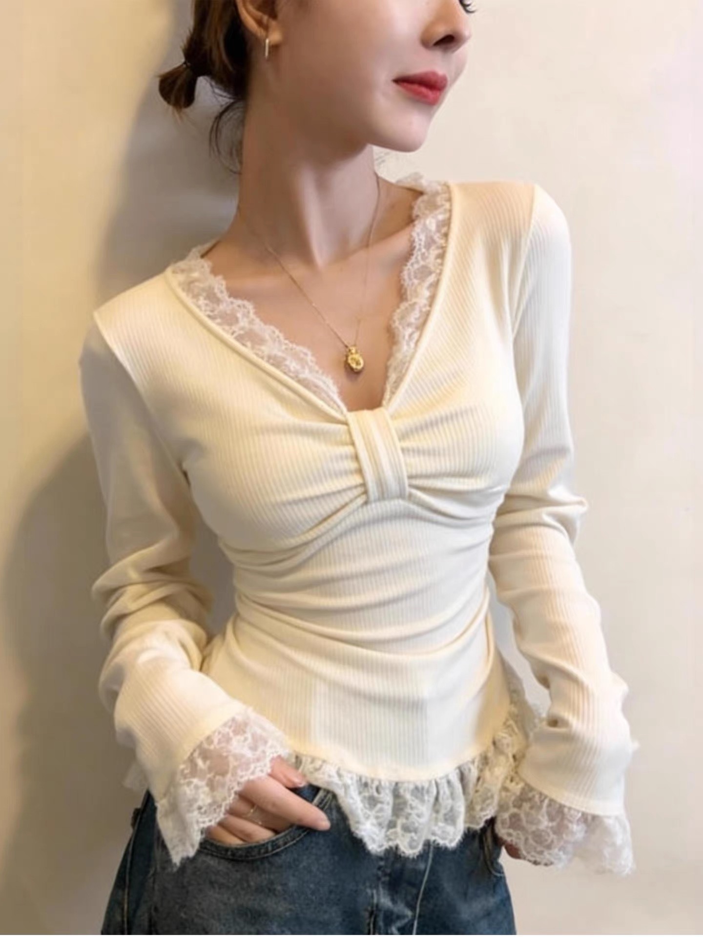 FA53135# 法式蕾丝拼接扭结V领长袖打底衫女内搭秋冬微胖mm大码设计感上衣 服裝批發女裝批發服飾貨源