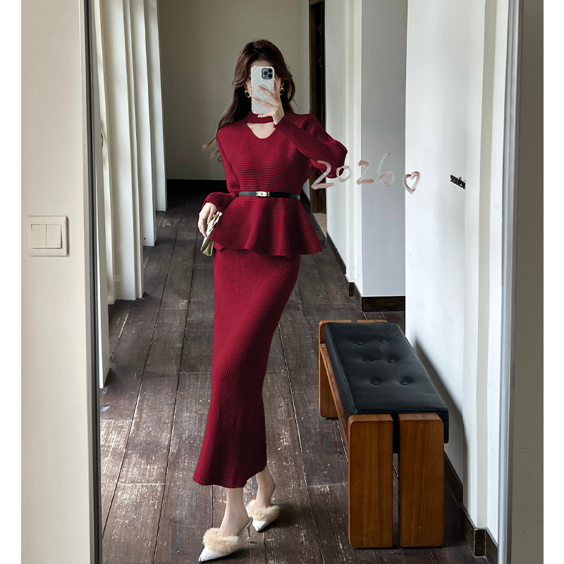 FA53142# 新年战袍设计感挂脖荷叶边收腰上衣半身裙配腰带针织毛衣三件套 服裝批發女裝批發服飾貨源