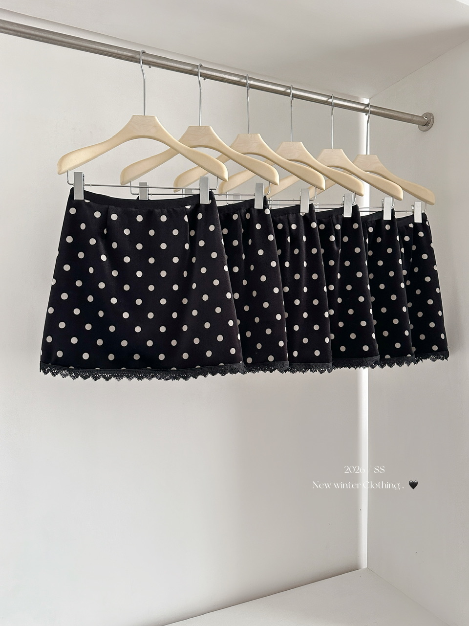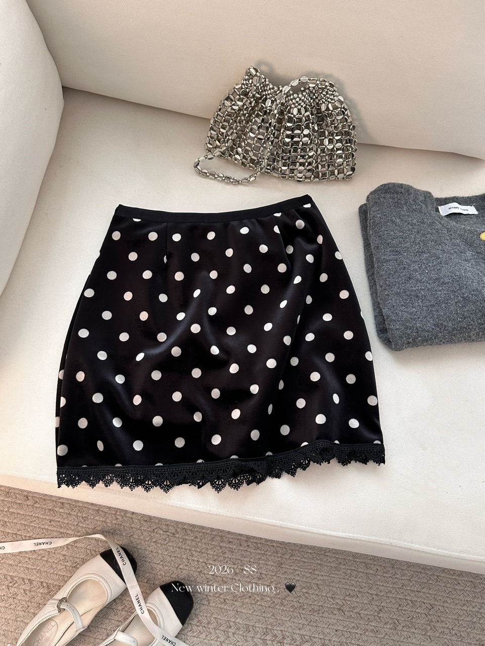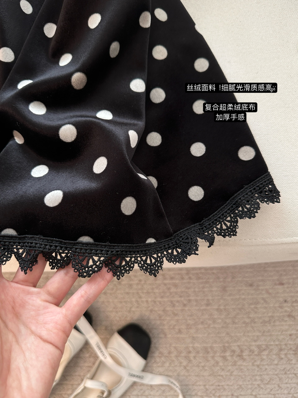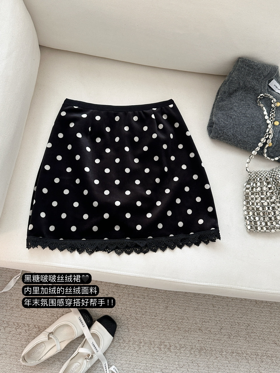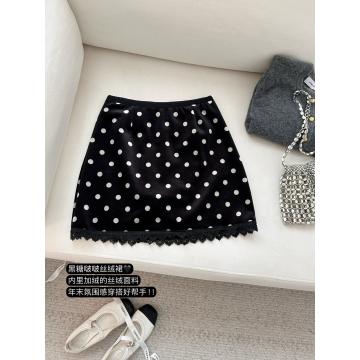 FA53165# 冬季丝绒半身裙黑波点印花加绒短裙蕾丝拼接 服裝批發女裝批發服飾貨源