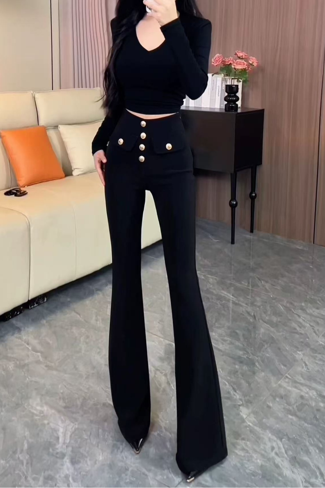 FA53180# 黑色金属纽扣微喇西装裤女秋冬新款高个子弹力修身显瘦马蹄裤 服裝批發女裝批發服飾貨源