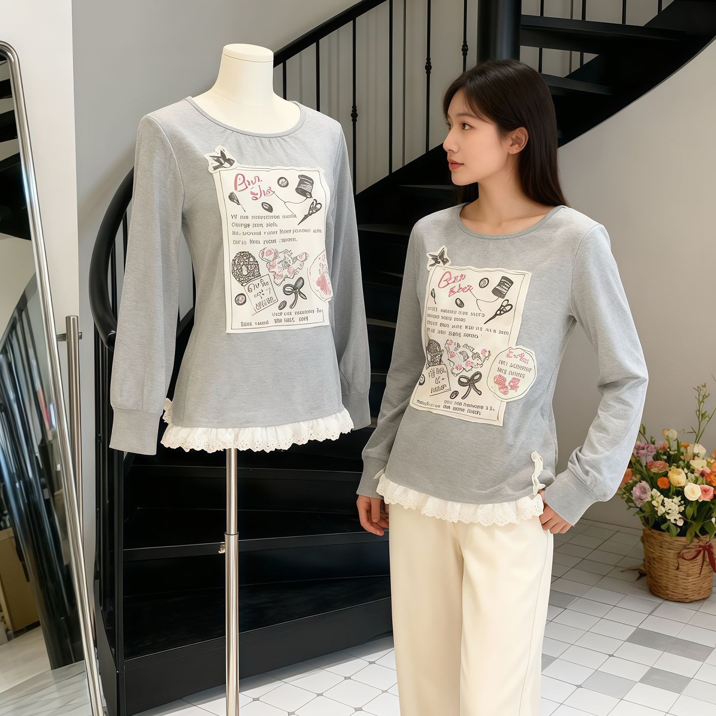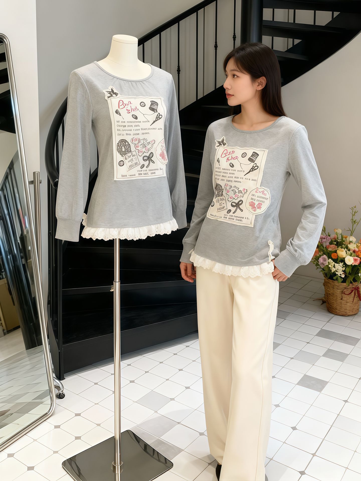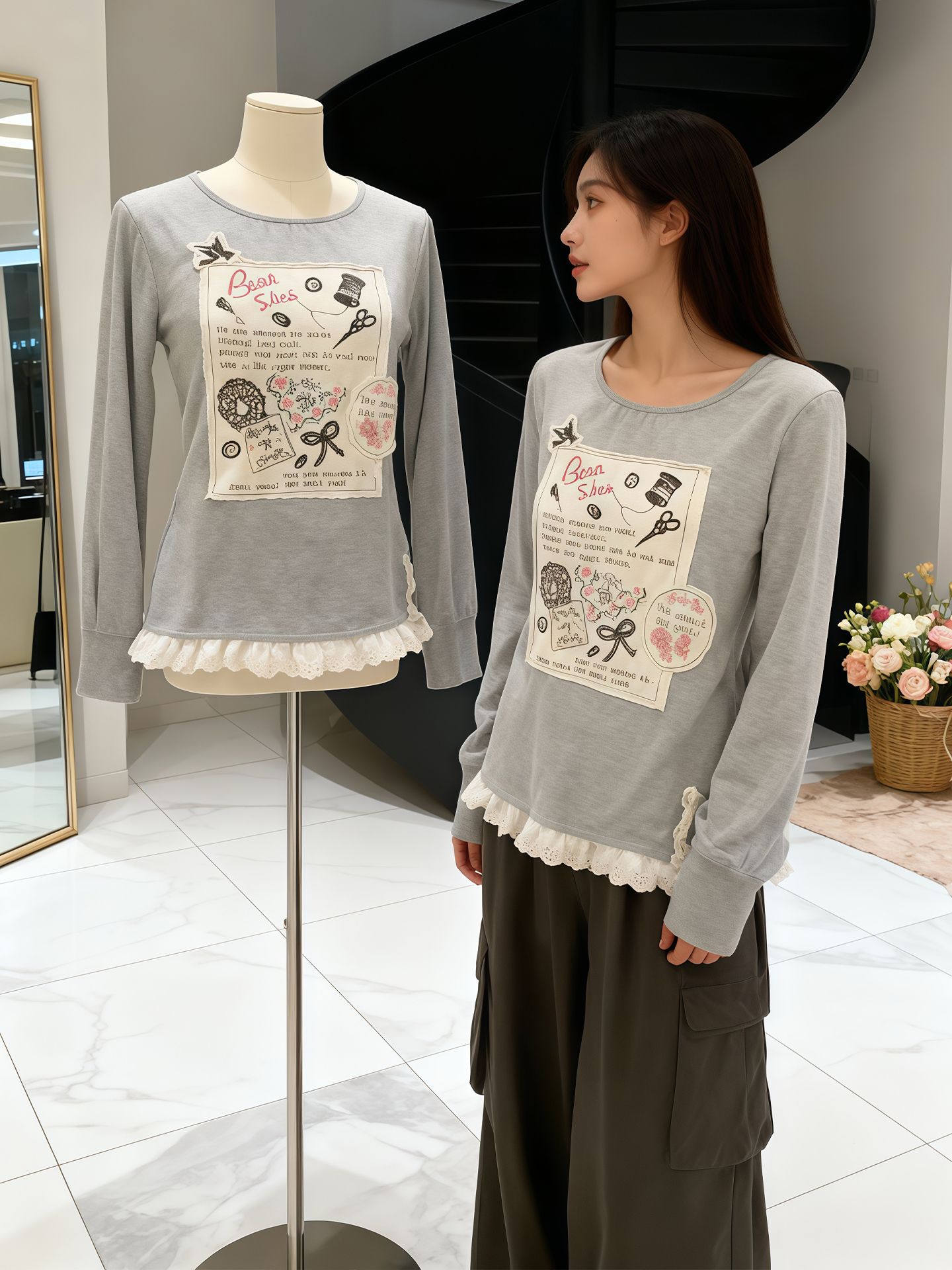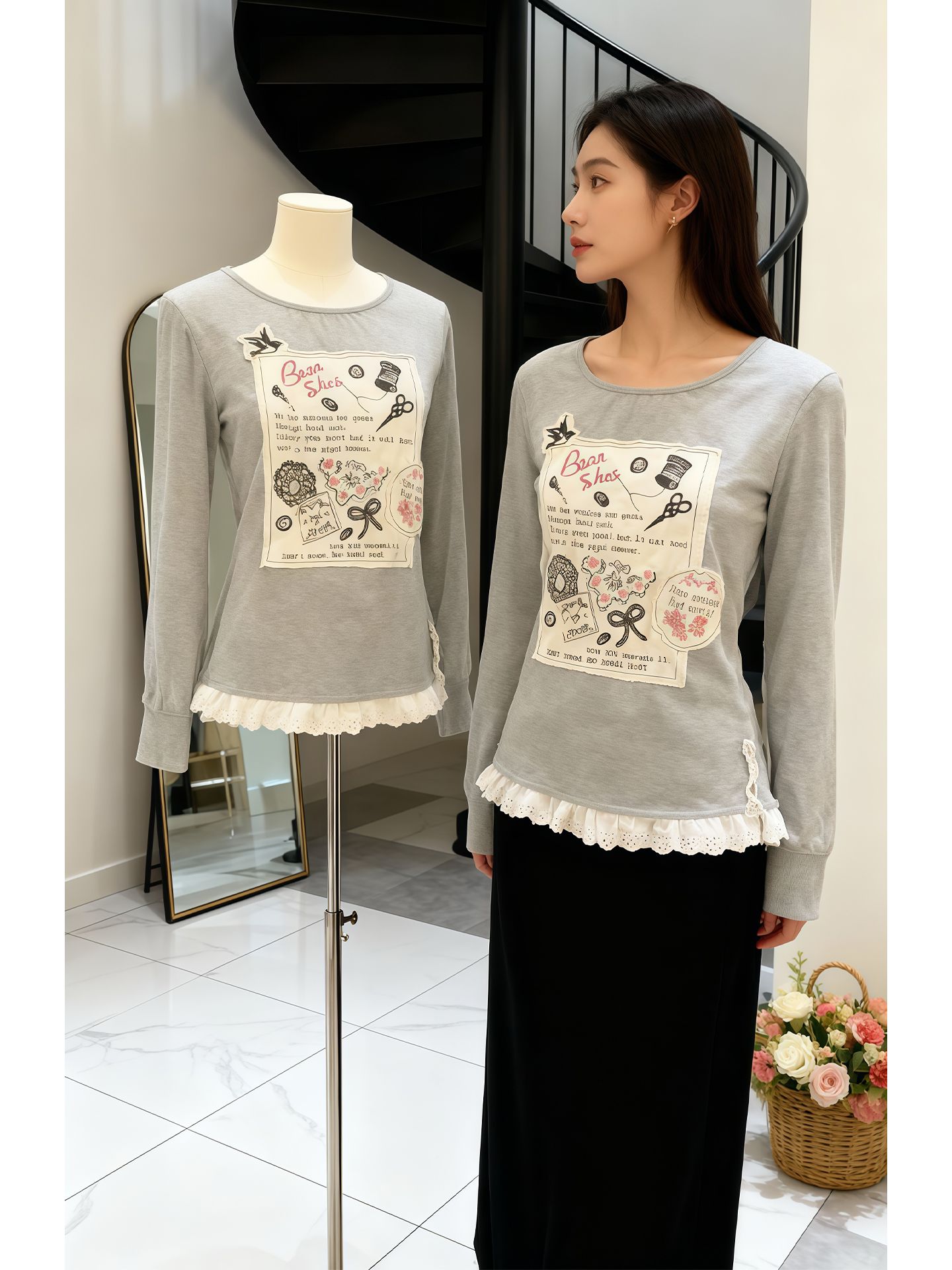 FA53303# 德绒1*1温柔风灰色蕾丝花边拼接圆领贴布长袖t恤秋季百搭上衣 服裝批發女裝批發服飾貨源