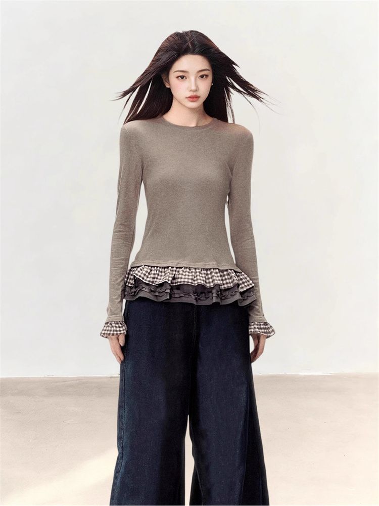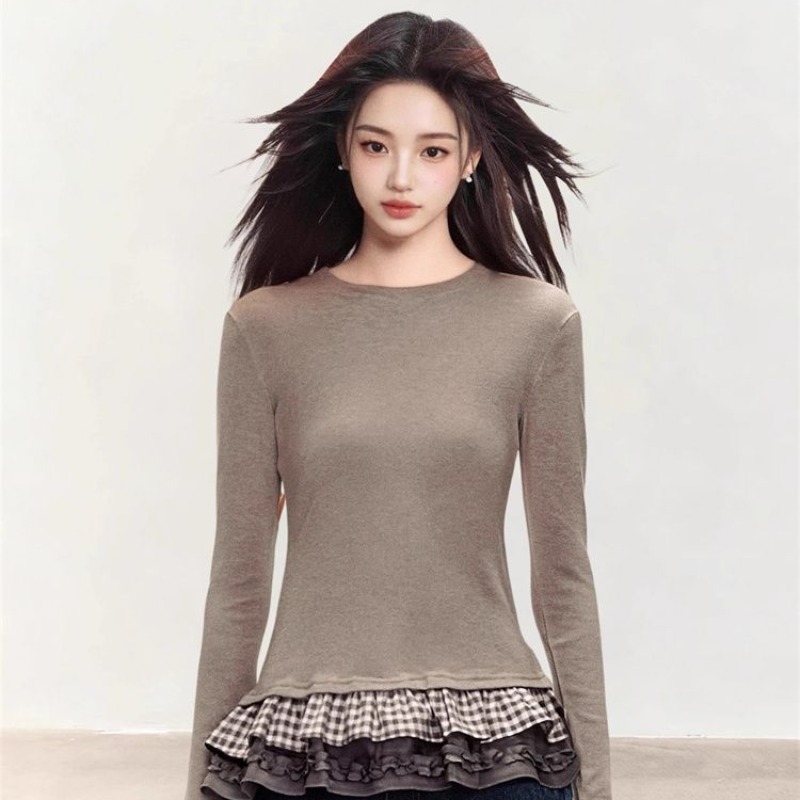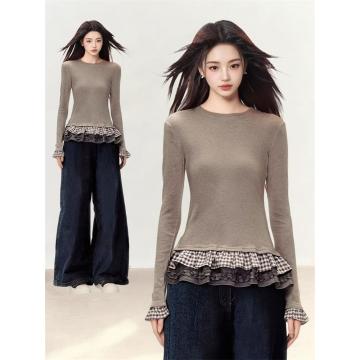 FA53304# 1*1德绒纯欲风荷叶花边下摆chic长袖T恤女生冬季修身打底衫上衣 服裝批發女裝批發服飾貨源