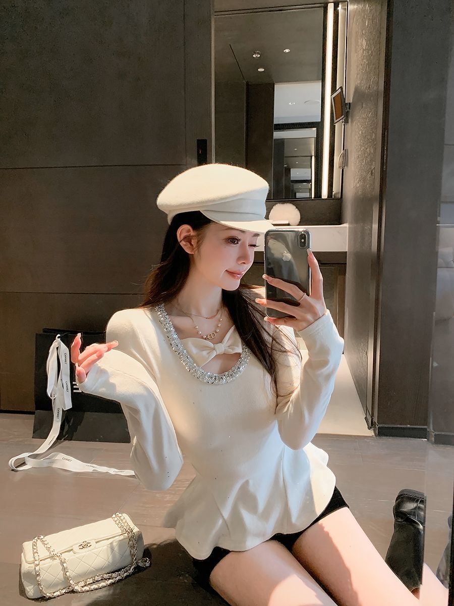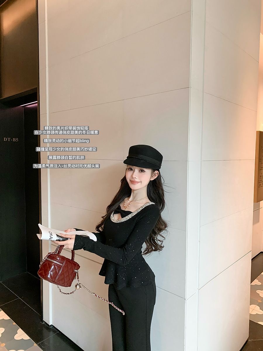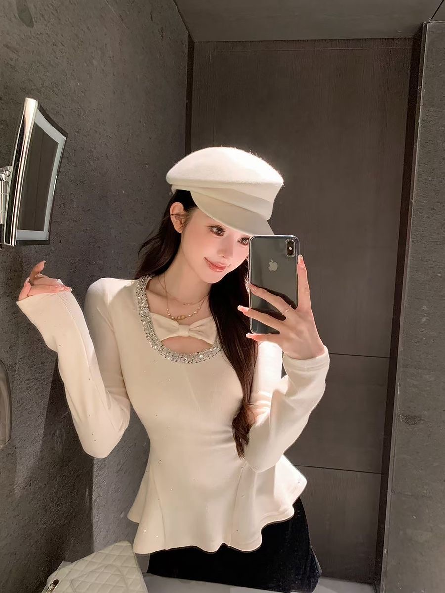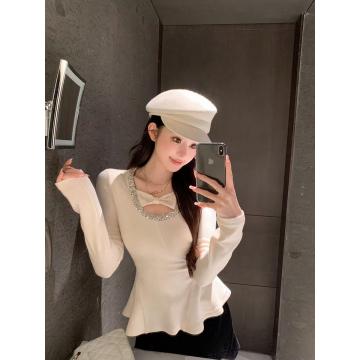 FA53319# 白色荷叶边内搭正肩长袖T恤女冬季新品收腰修身显瘦打底上衣爆款 服裝批發女裝批發服飾貨源