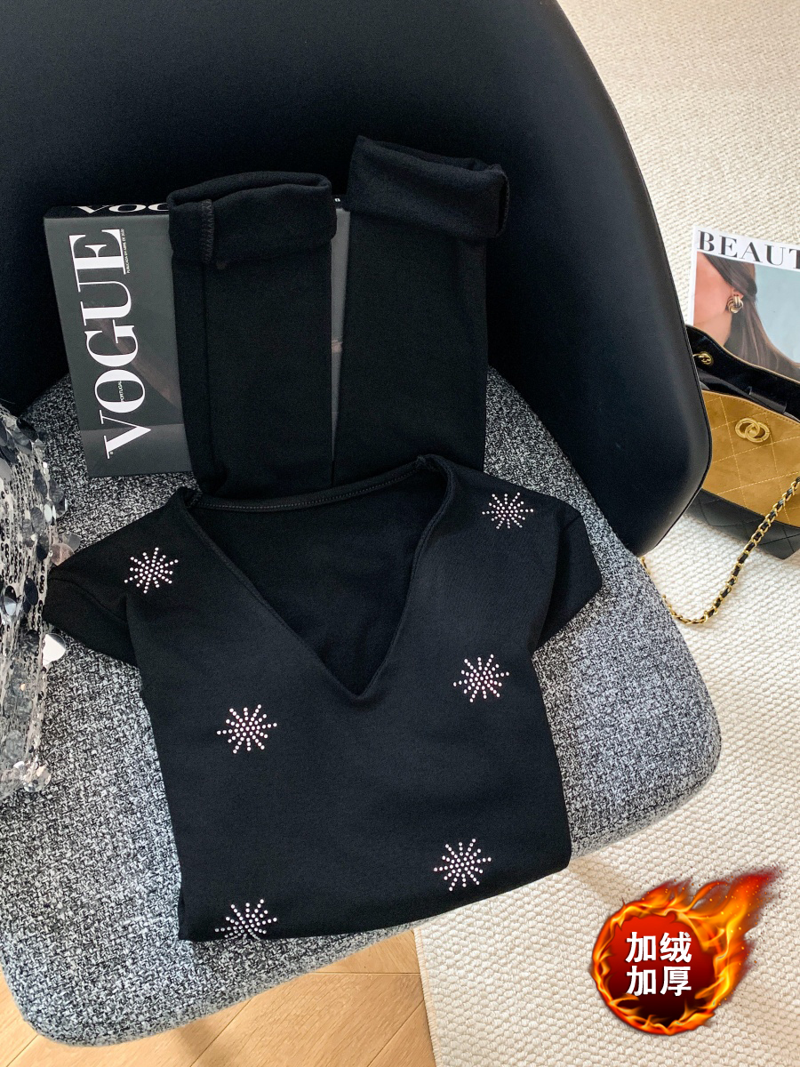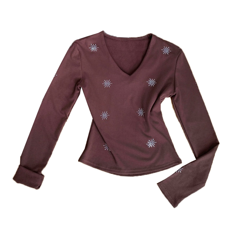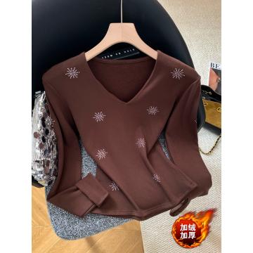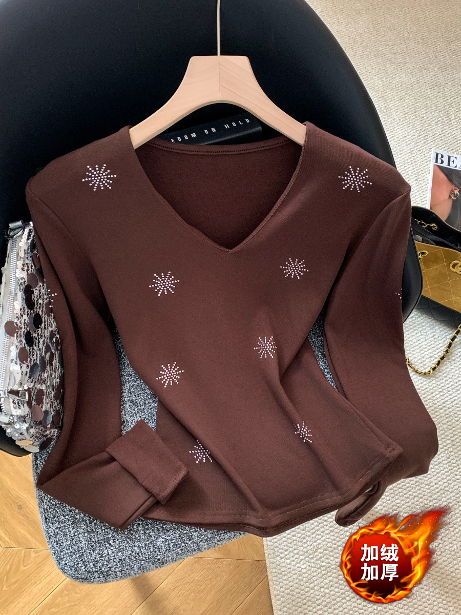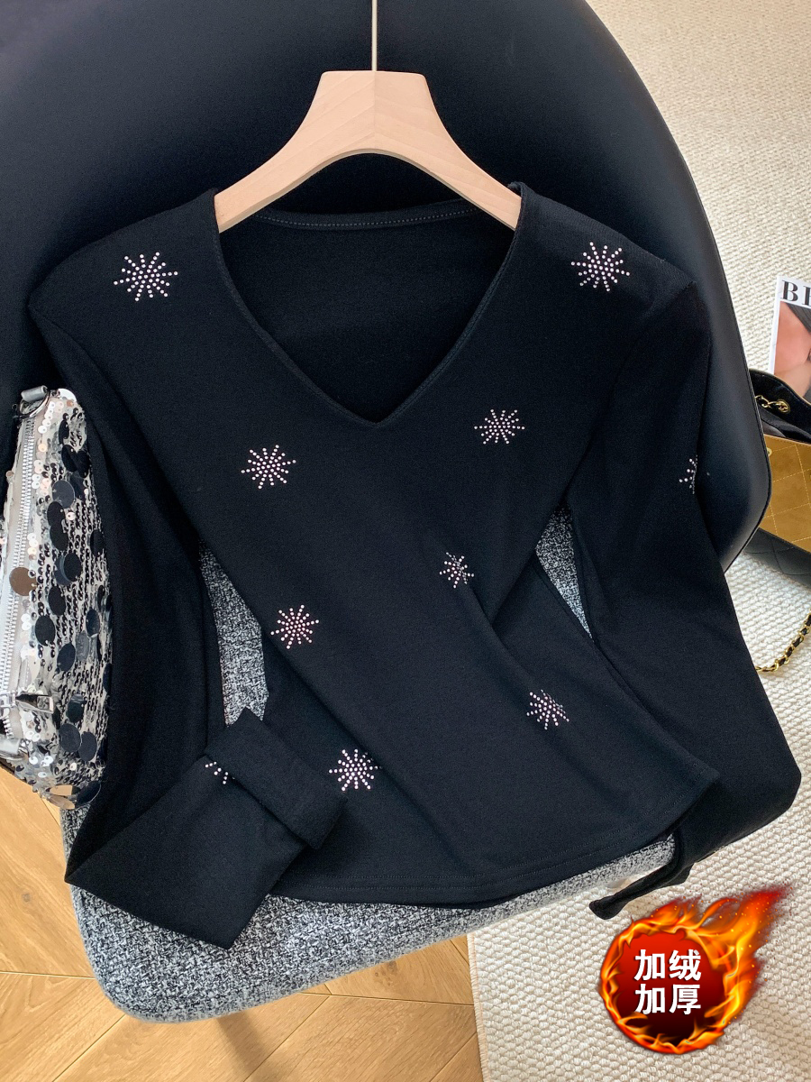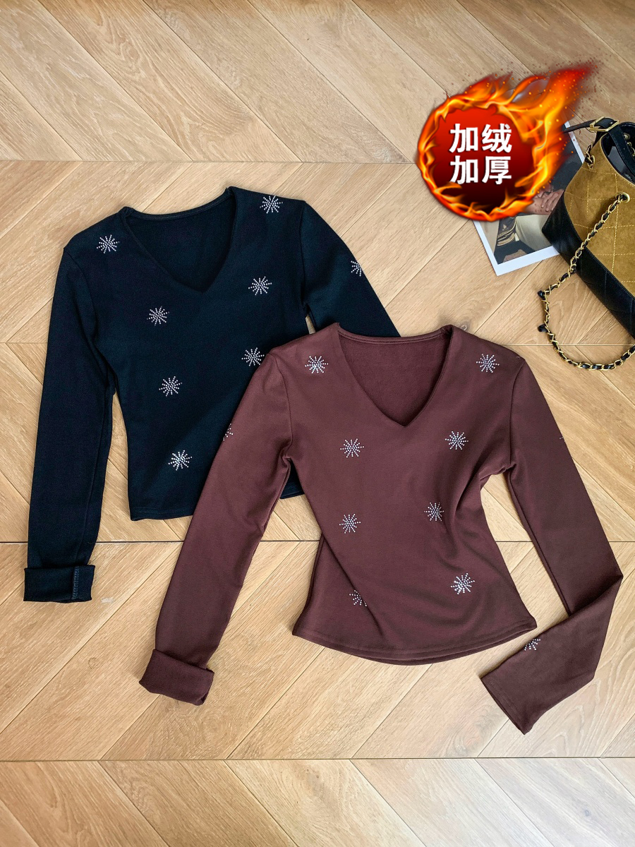 FA53324# 设计感V领烫钻长袖修身打底衫秋冬新款磨毛保暖别致上衣 服裝批發女裝批發服飾貨源