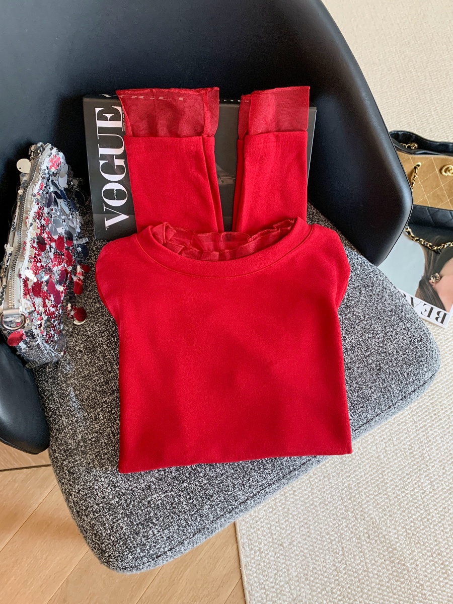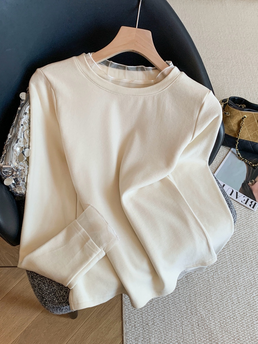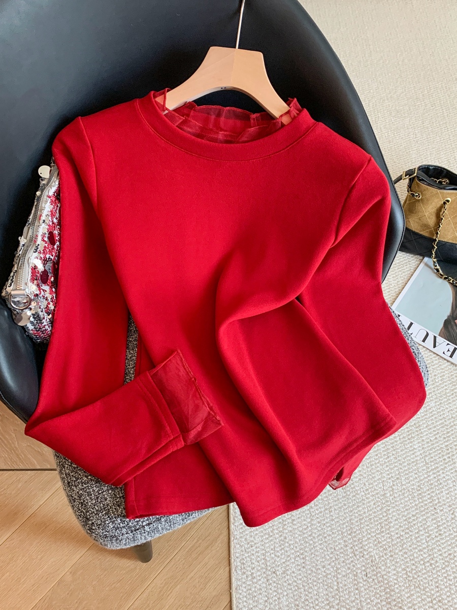 FA53328# 冬季新款长袖加绒打底衫T恤女蕾丝拼接时尚洋气百搭上衣 服裝批發女裝批發服飾貨源