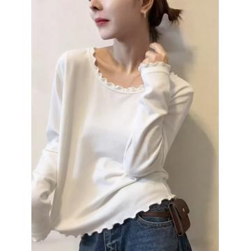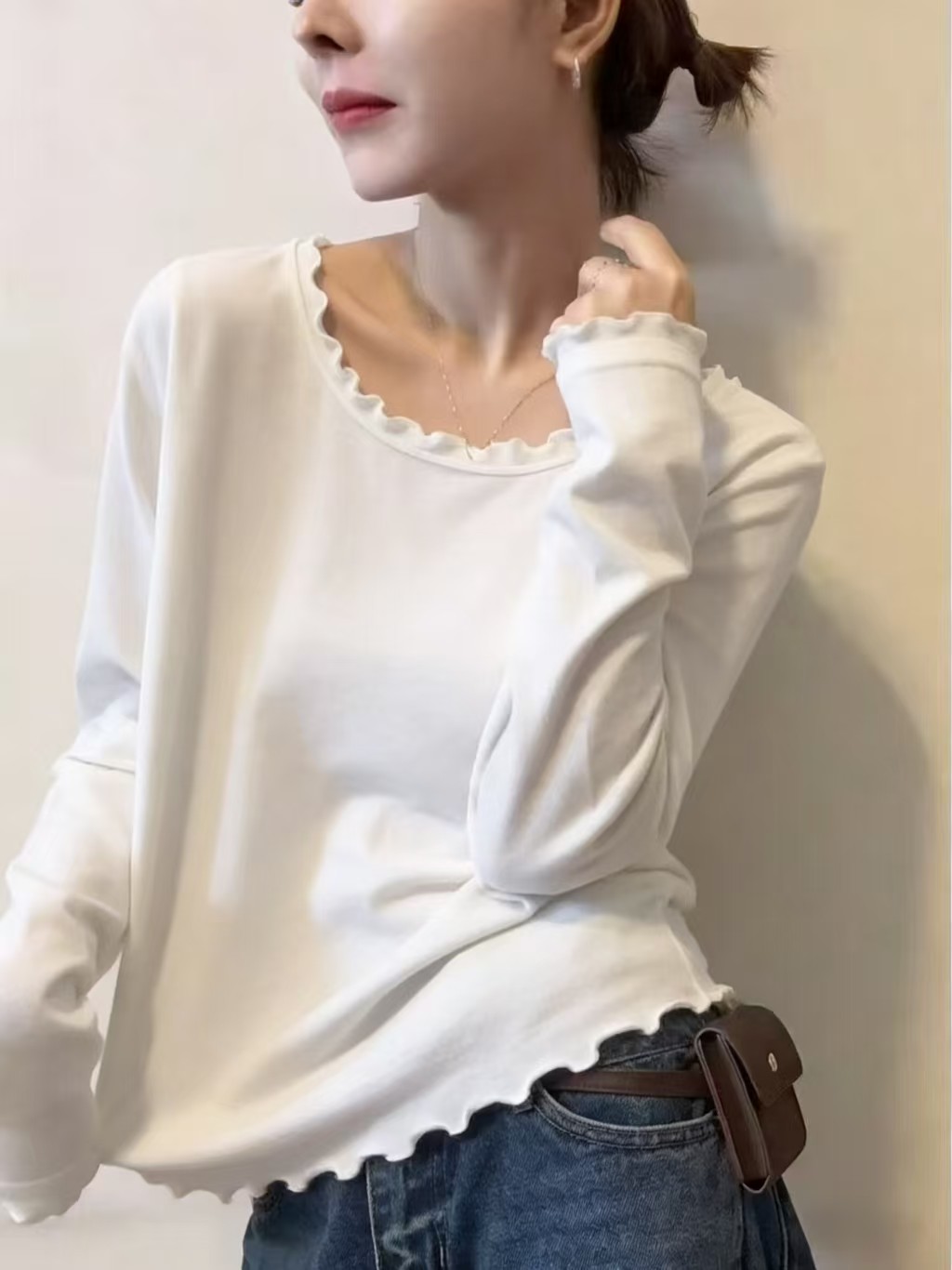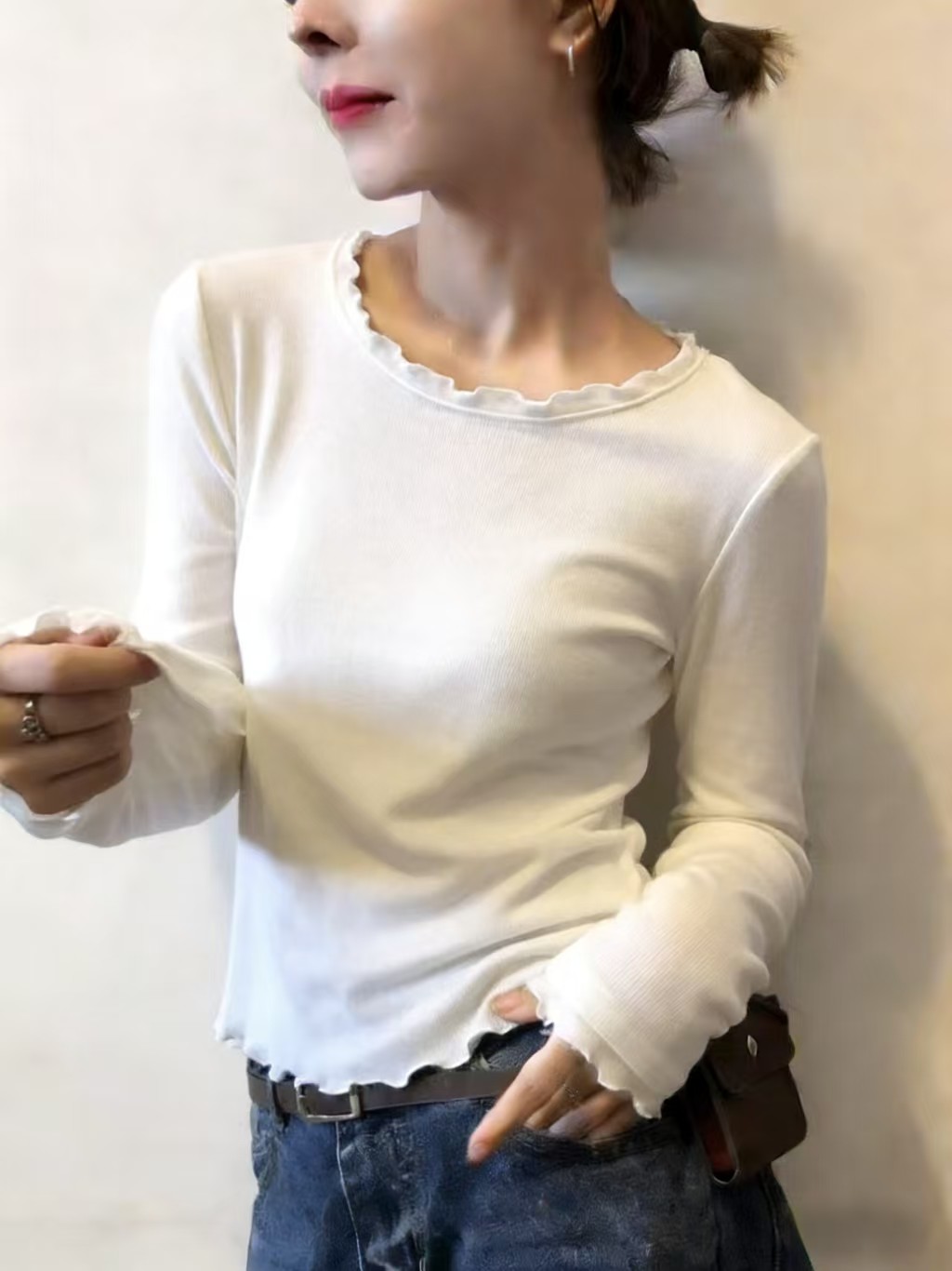 FA53368# 韩系简约风木耳边长袖t恤秋季新款修身显瘦内搭打底衫 服裝批發女裝批發服飾貨源