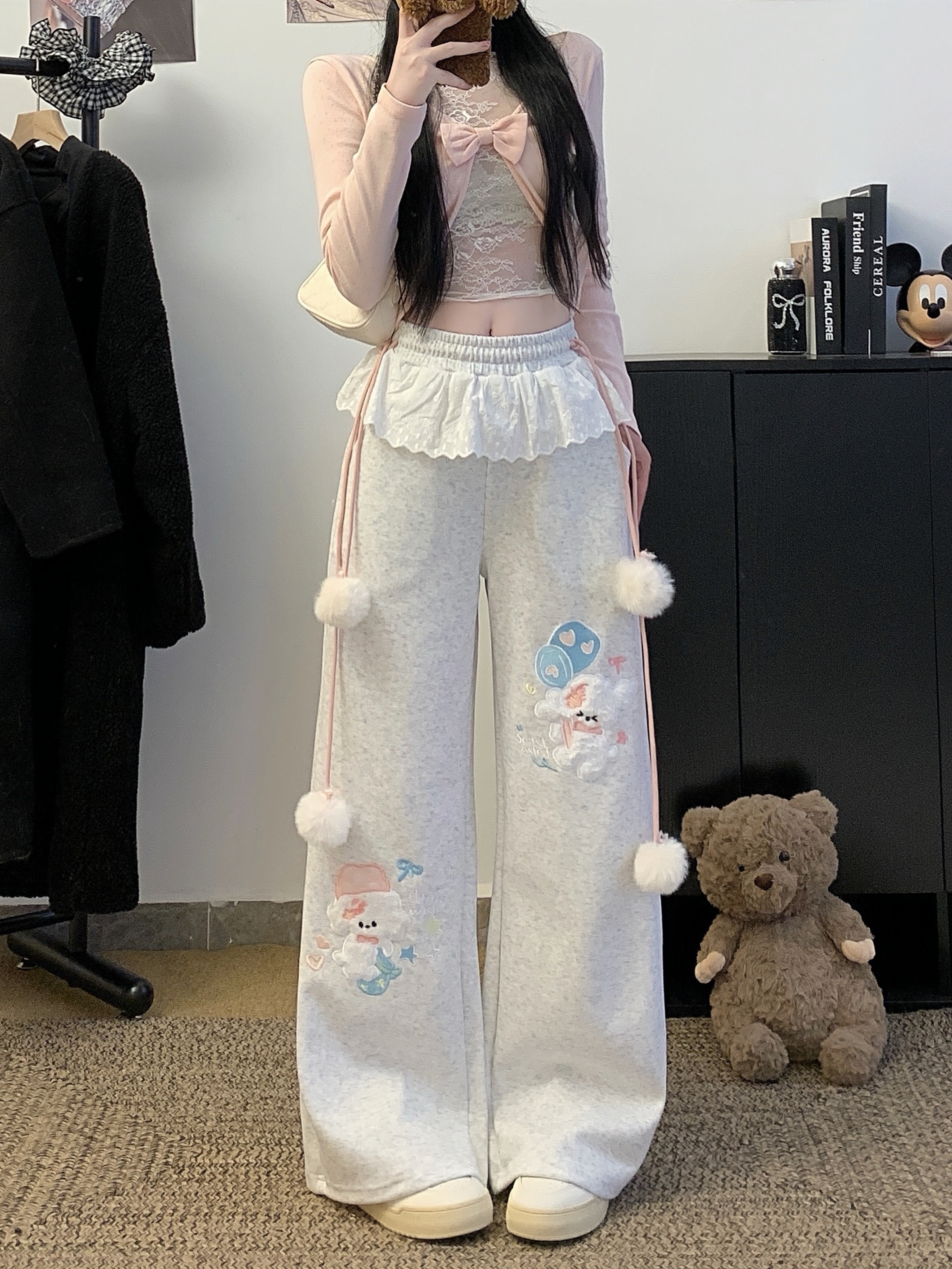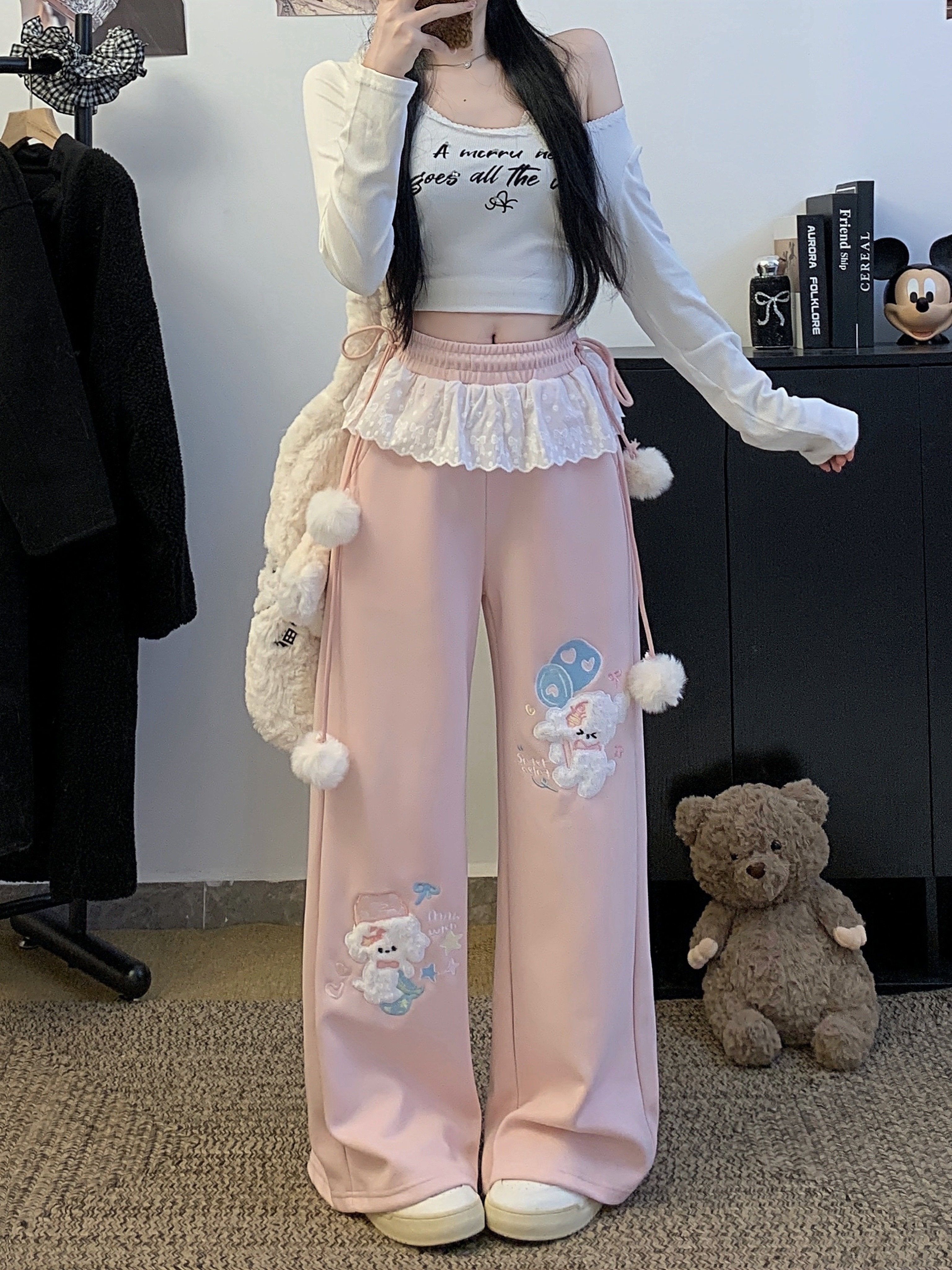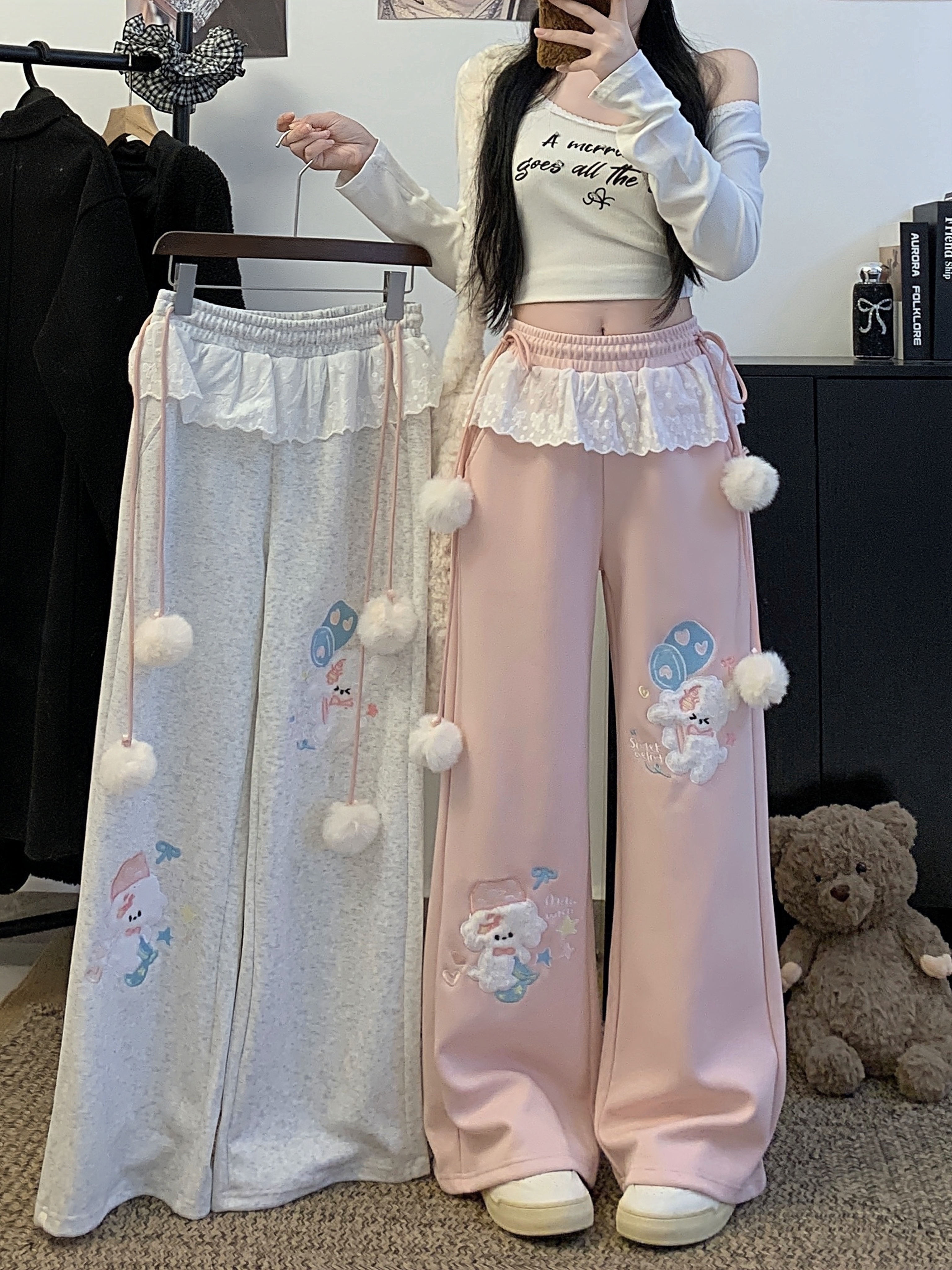 FA53374# 可爱刺绣小狗毛球抽绳休闲卫裤春秋款蕾丝拼接少女慵懒拖地裤 服裝批發女裝批發服飾貨源