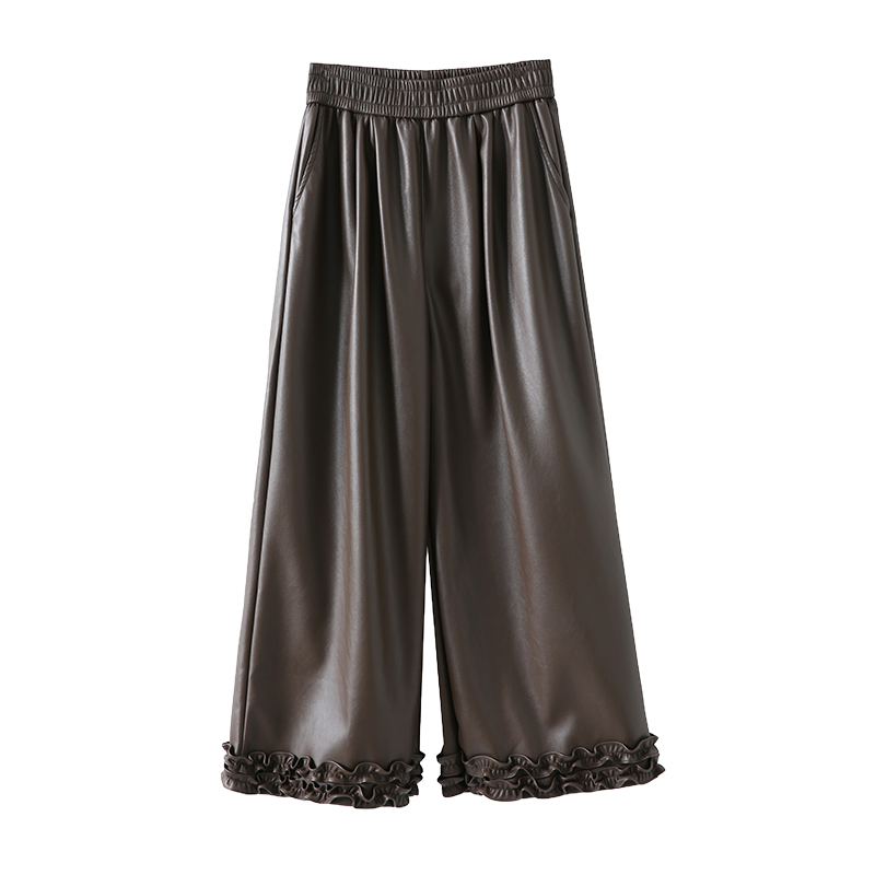 FA53380# 木耳边软皮裤女春秋新款高腰阔腿裤时尚气质百搭直筒裤子 服裝批發女裝批發服飾貨源