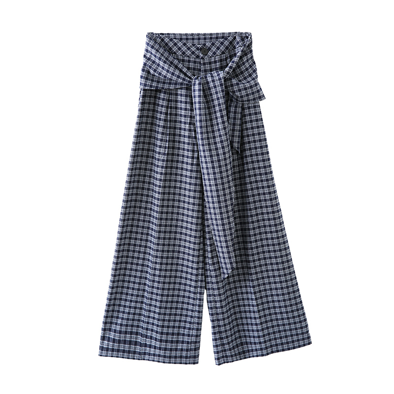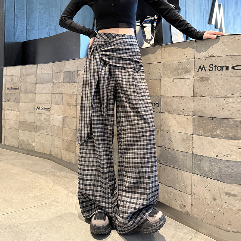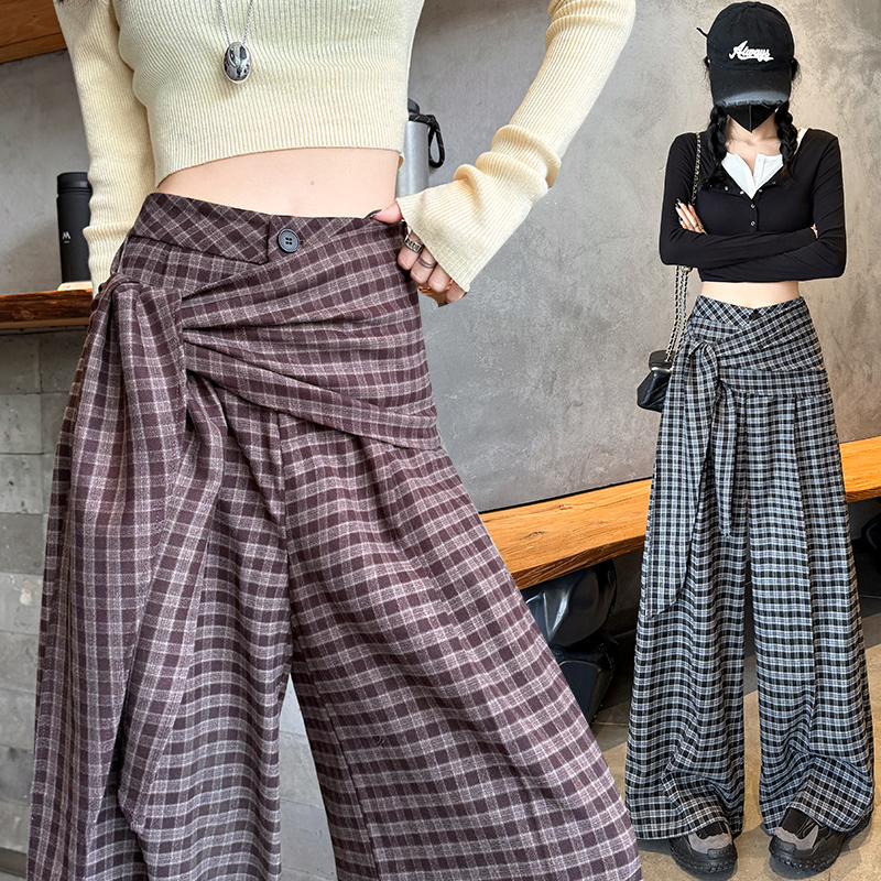 FA53382# 复古格子绑带阔腿裤女春秋新款高腰宽松垂感休闲直筒拖地长裤 服裝批發女裝批發服飾貨源