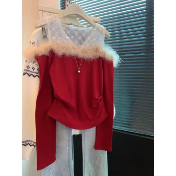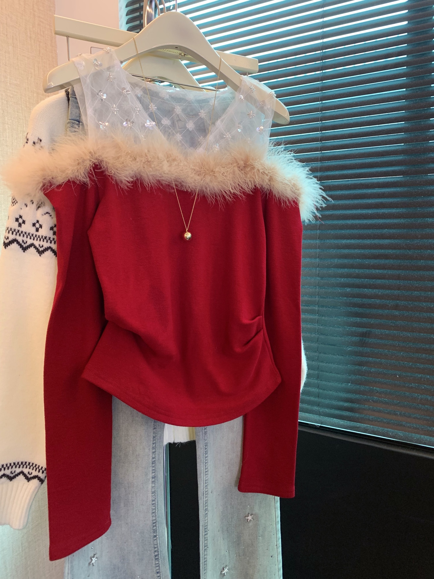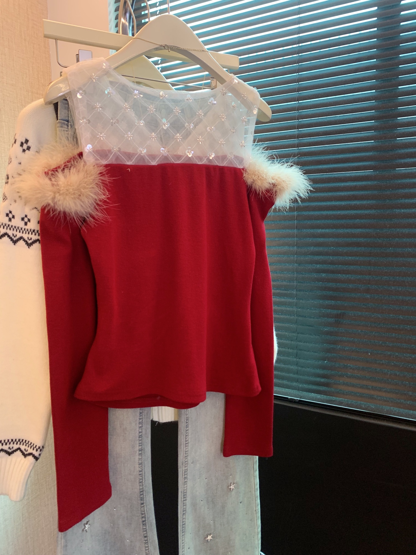 FA53397# 上千金假两件亮片网纱长袖t恤女纯欲一字肩毛毛领上衣打底衫 服裝批發女裝批發服飾貨源